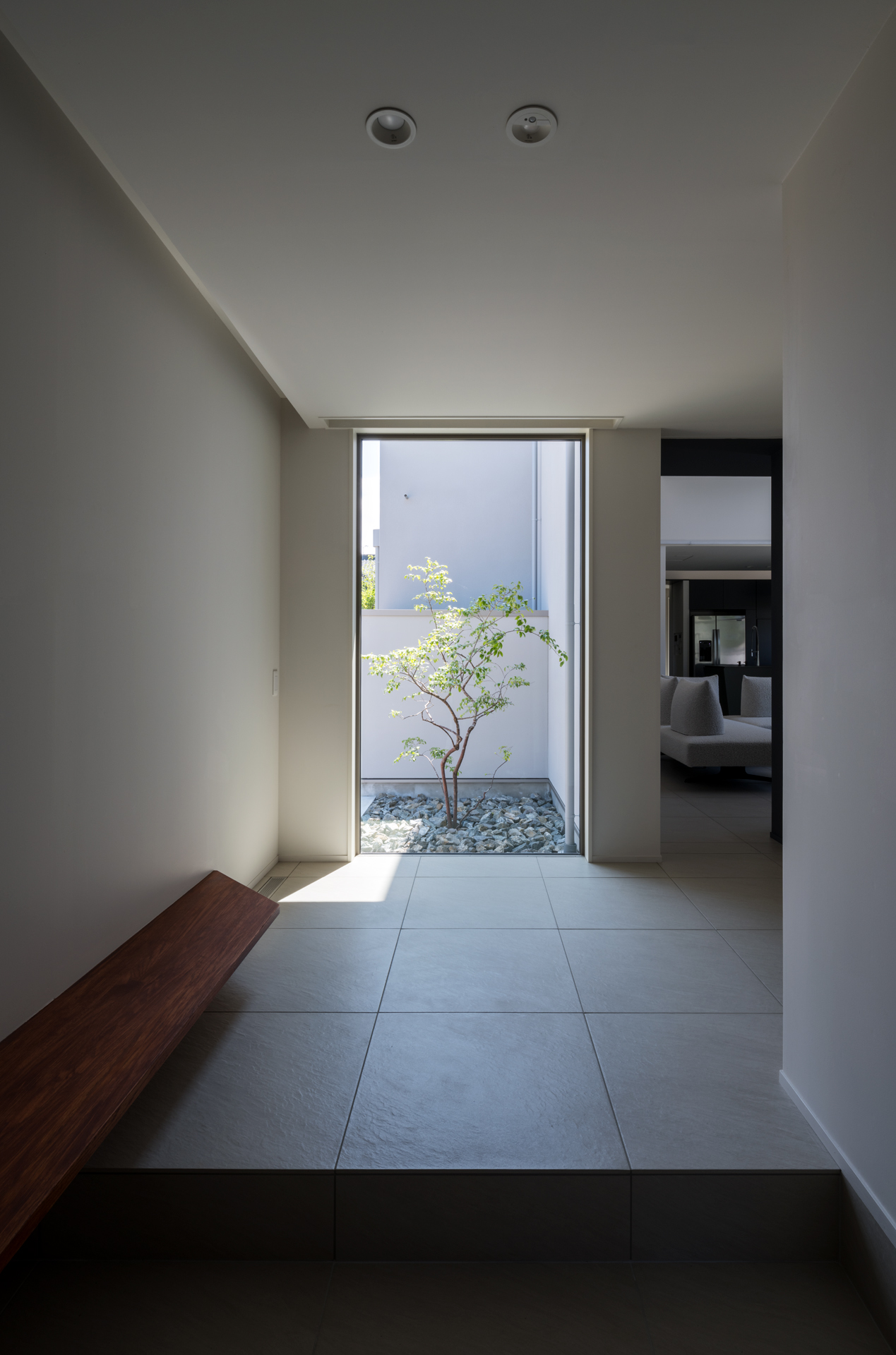 扉を開けて玄関に入ると、正面に光庭の景色が飛び込んでくる。閉塞感を生みがちな玄関に、視線の抜けと自然光をもたらす工夫だ。