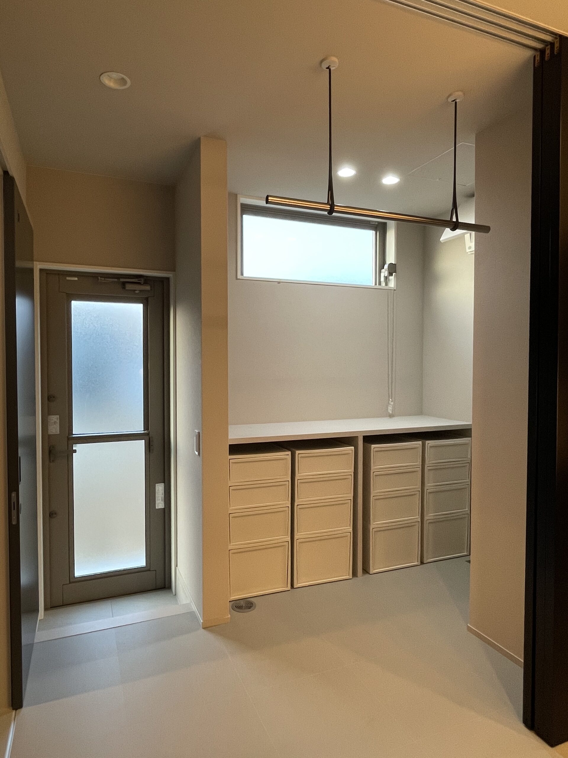 ランドリールームには勝手口を。仕事から帰ったNさんはこの勝手口から直接入り、入浴や着替えができるという。