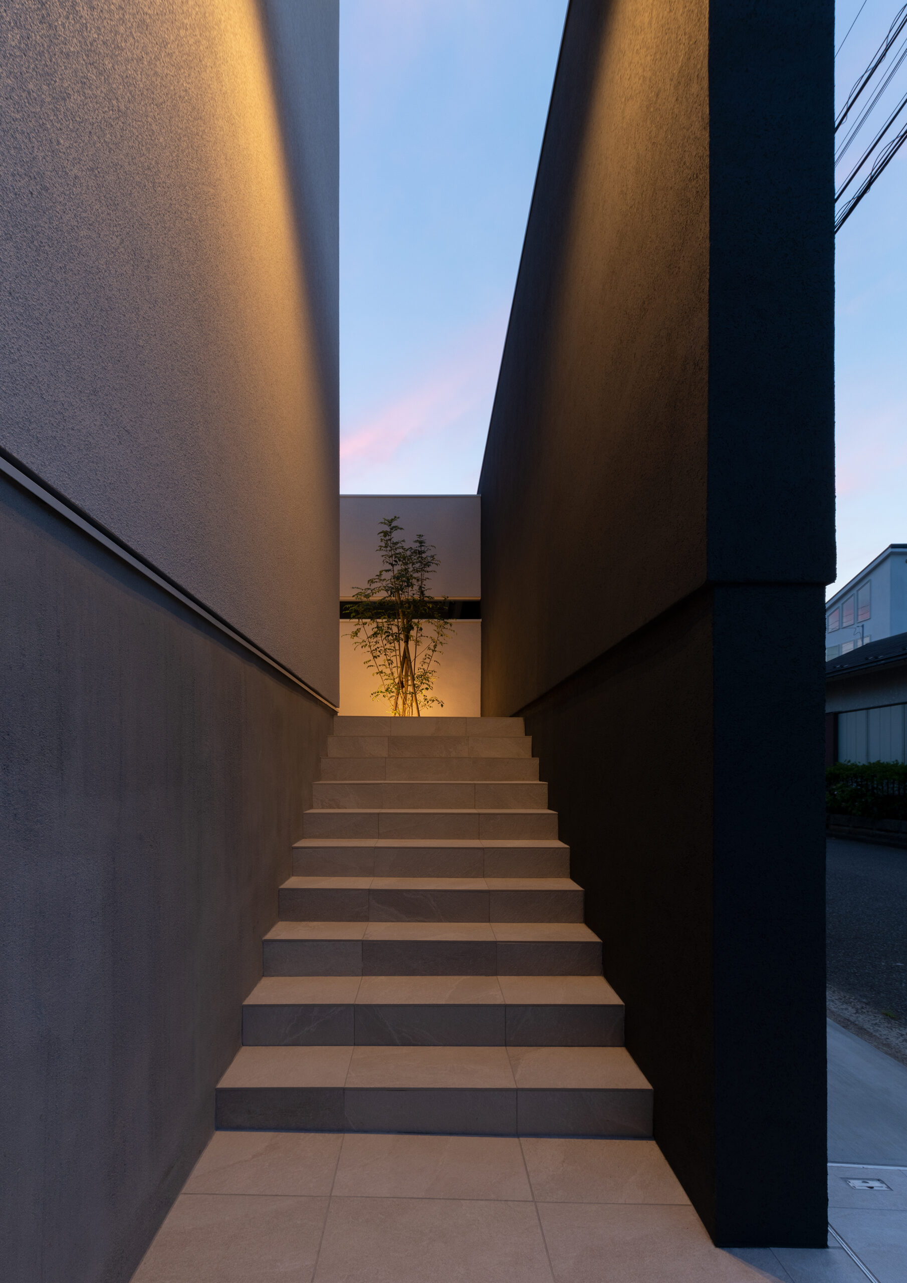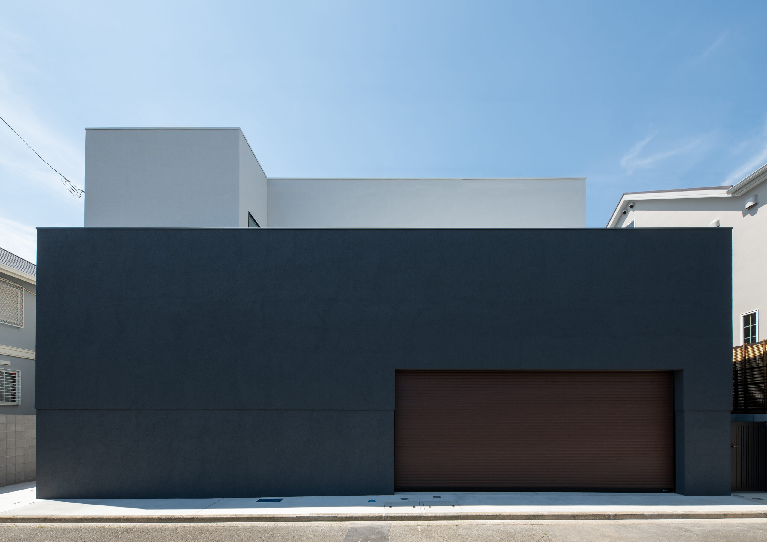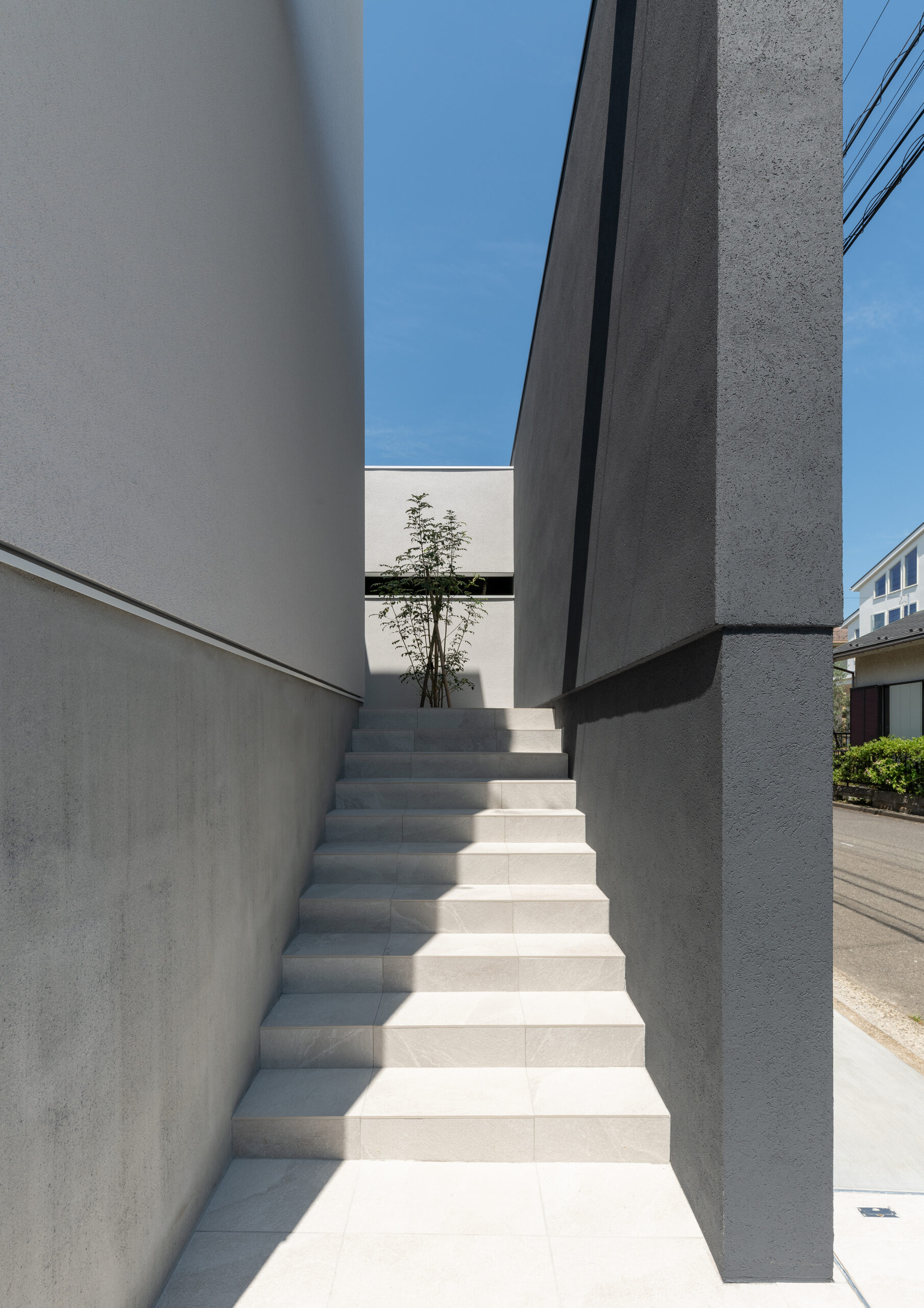 巨大な暗色の壁が印象的な正面外観。壁の奥に階段があり、玄関が道路から直接見えない。家の構成がわからないだけでなく、階段を登る時にワクワク感を感じられる空間になっている。周囲との調和を考えて黒ではない暗色とした配色は、重量感を与える意図もある