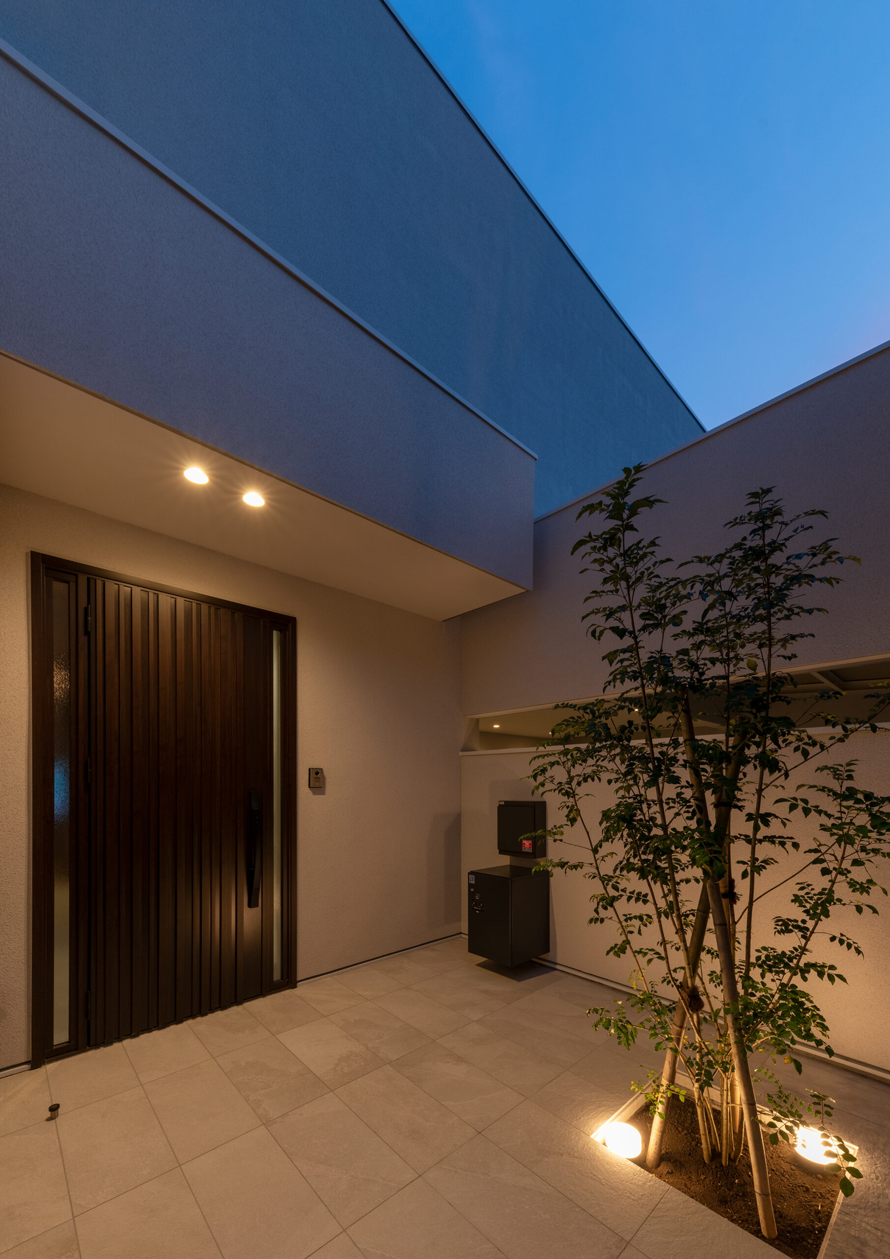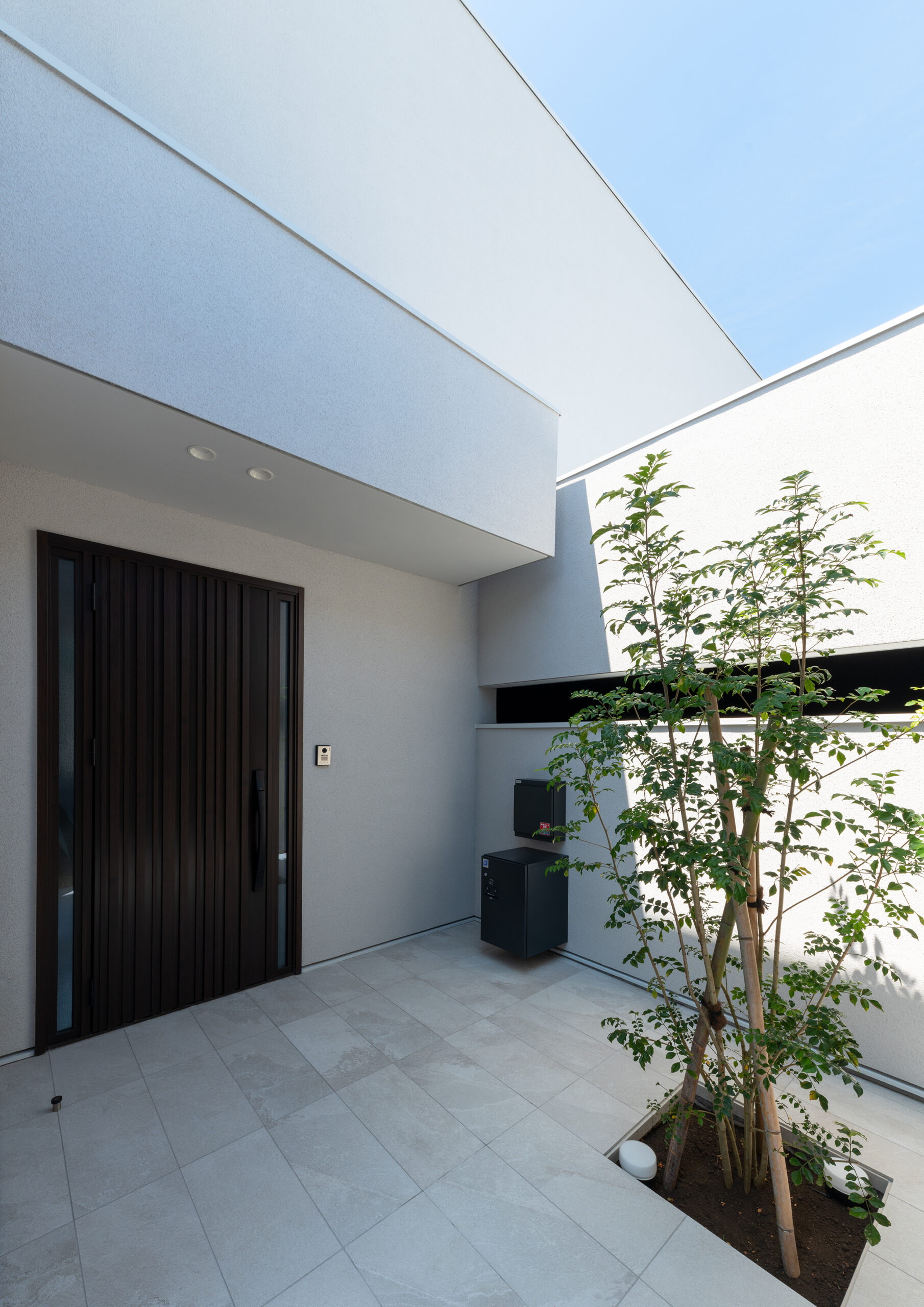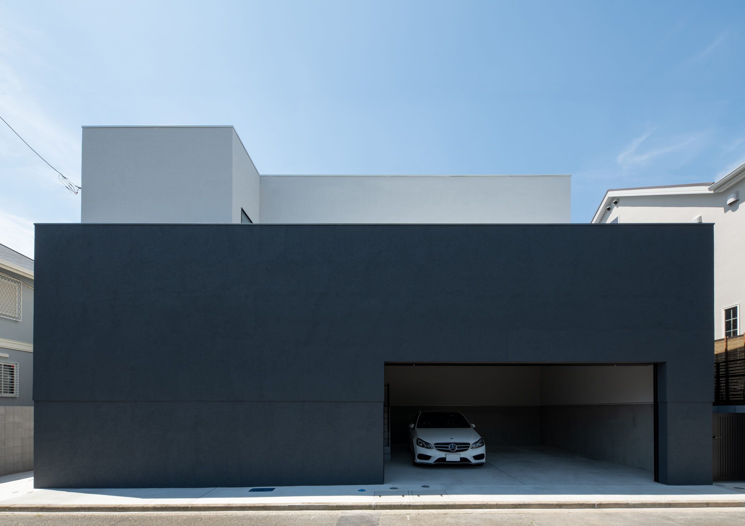 巨大な暗色の壁が印象的な正面外観。壁の奥に階段があり、玄関が道路から直接見えない。家の構成がわからないだけでなく、階段を登る時にワクワク感を感じられる空間になっている。周囲との調和を考えて黒ではない暗色とした配色は、重量感を与える意図もある