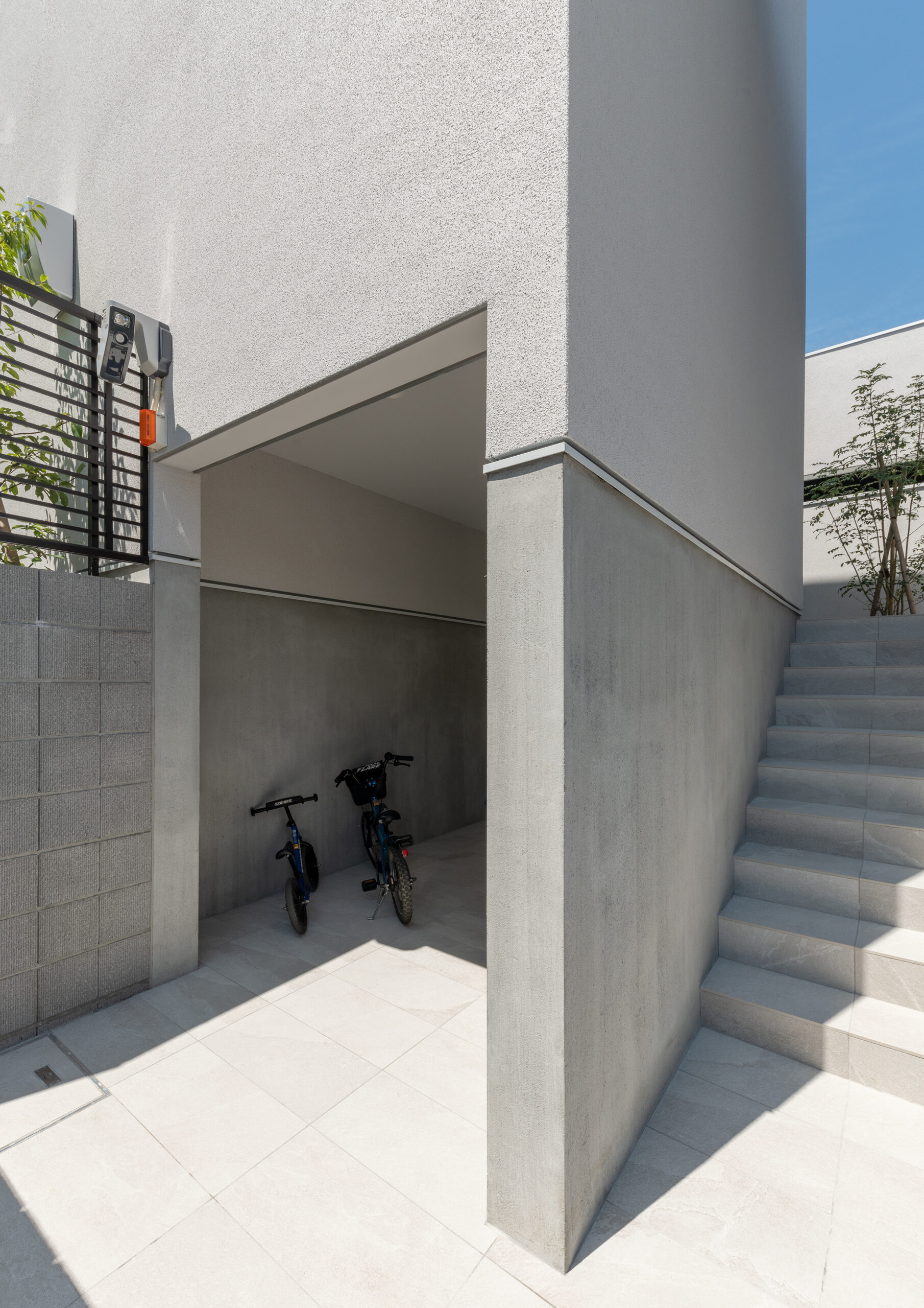 壁の裏に配置された、自転車の駐輪場。生活感を減らし、美観の維持にとても効果的な工夫だ