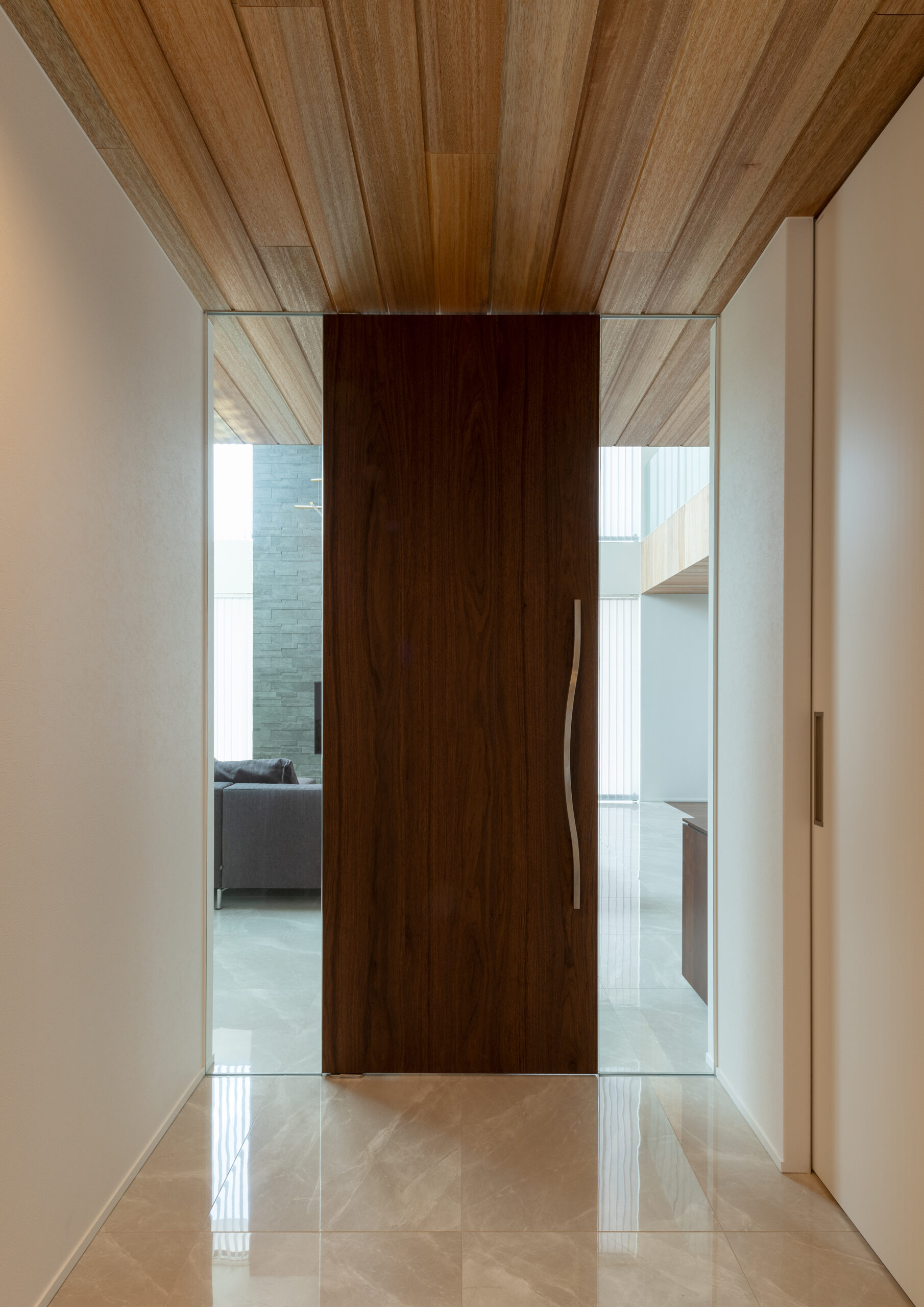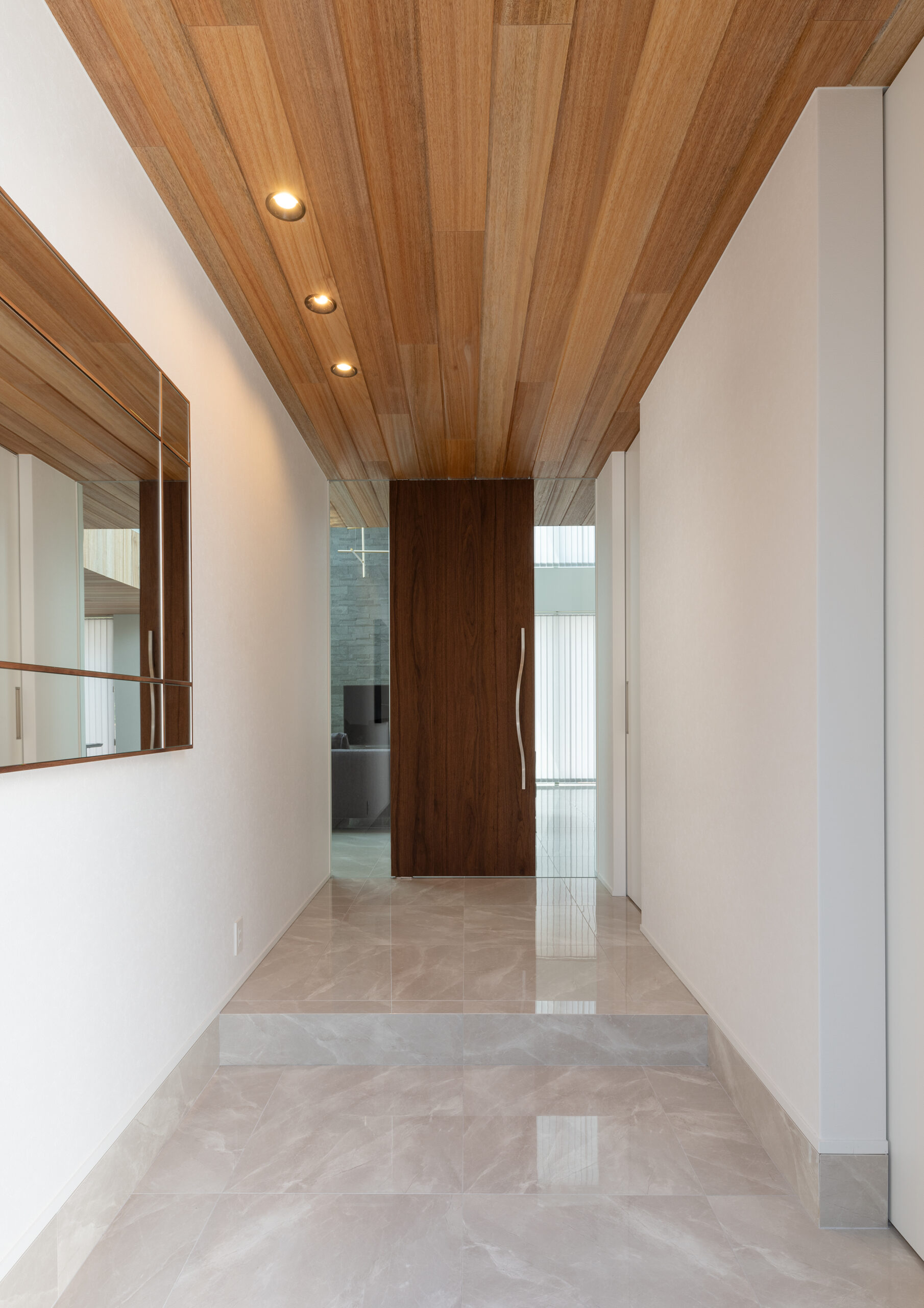6畳以上の広さを確保した玄関前ホール。駐車場の吹き抜け部分にある横スリットで、中の気配がわかる
