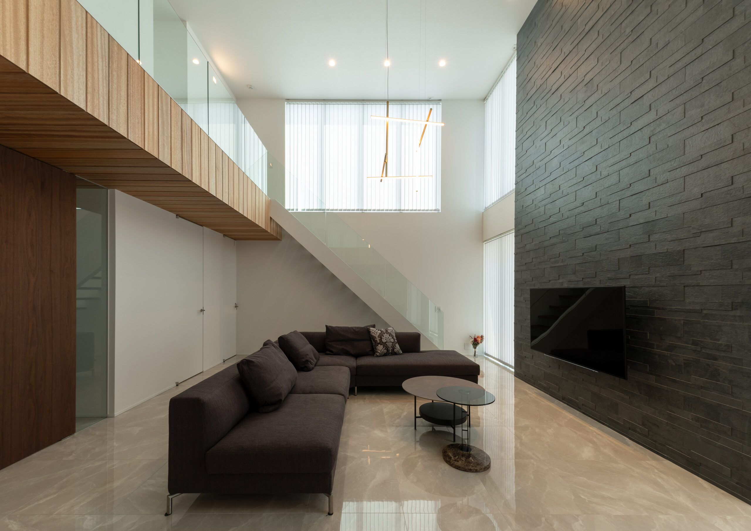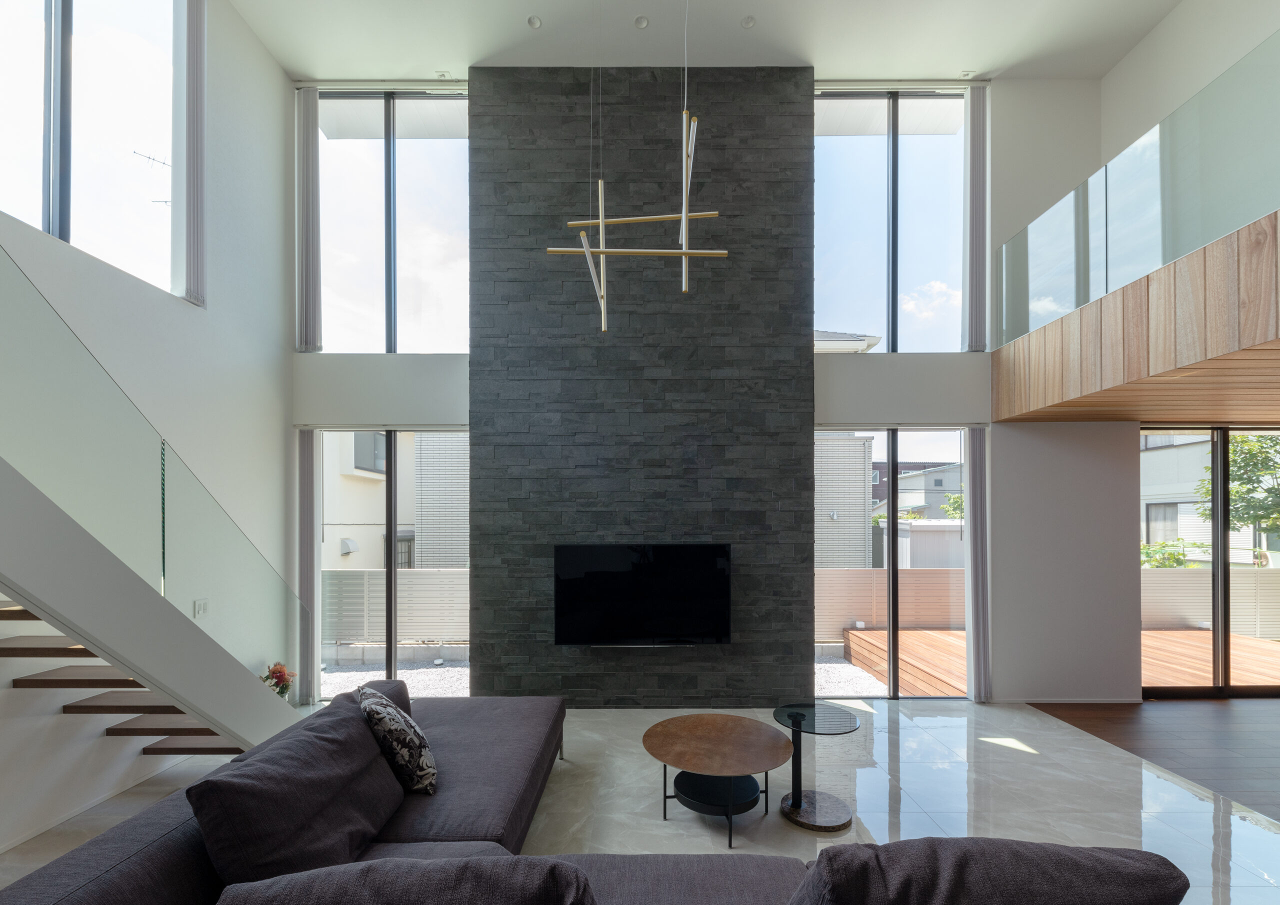 壁の裏にある階段。気持ちを切り替える空間でもある。1mの高低差をマイナスではなくプラスにした工夫だ