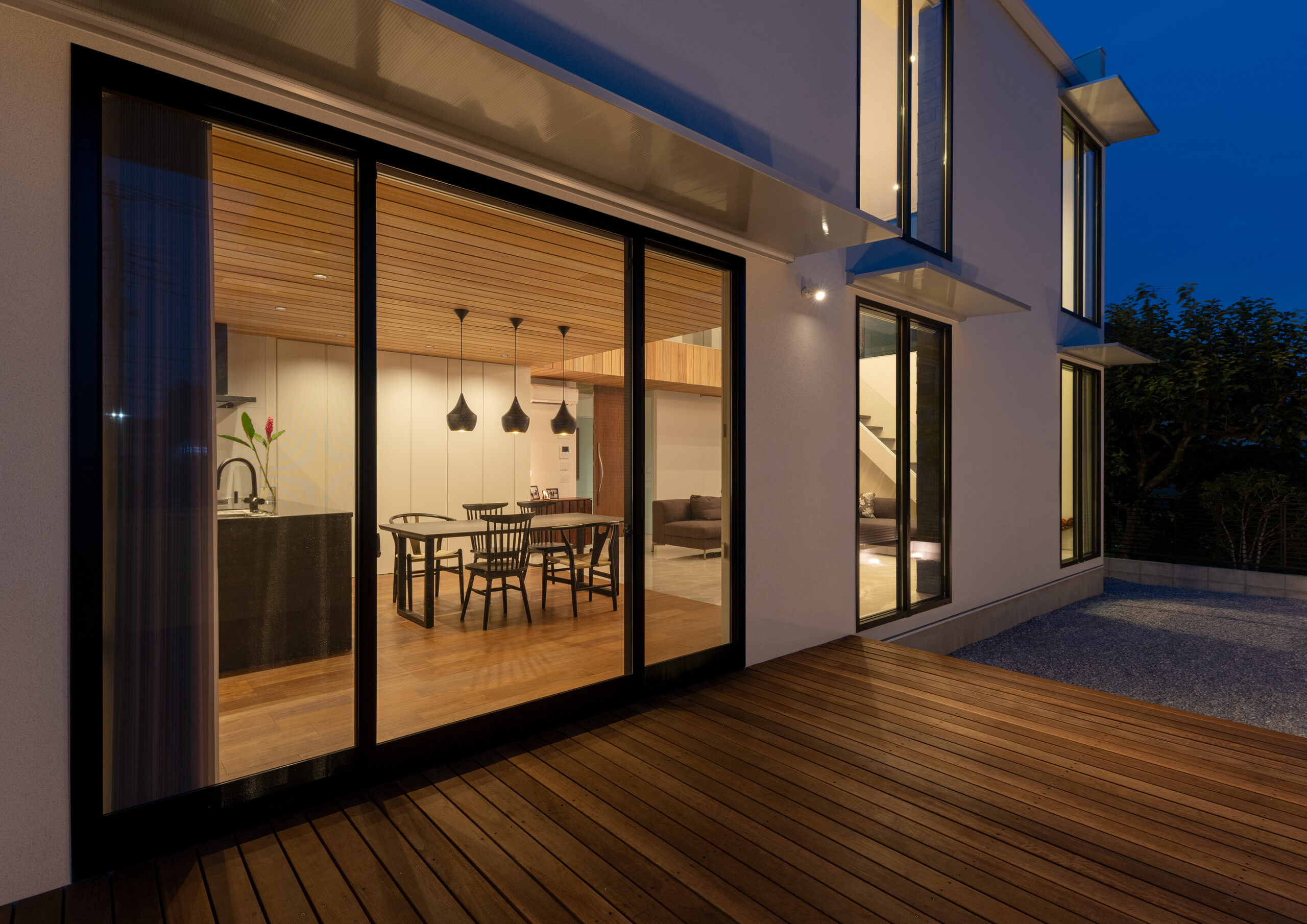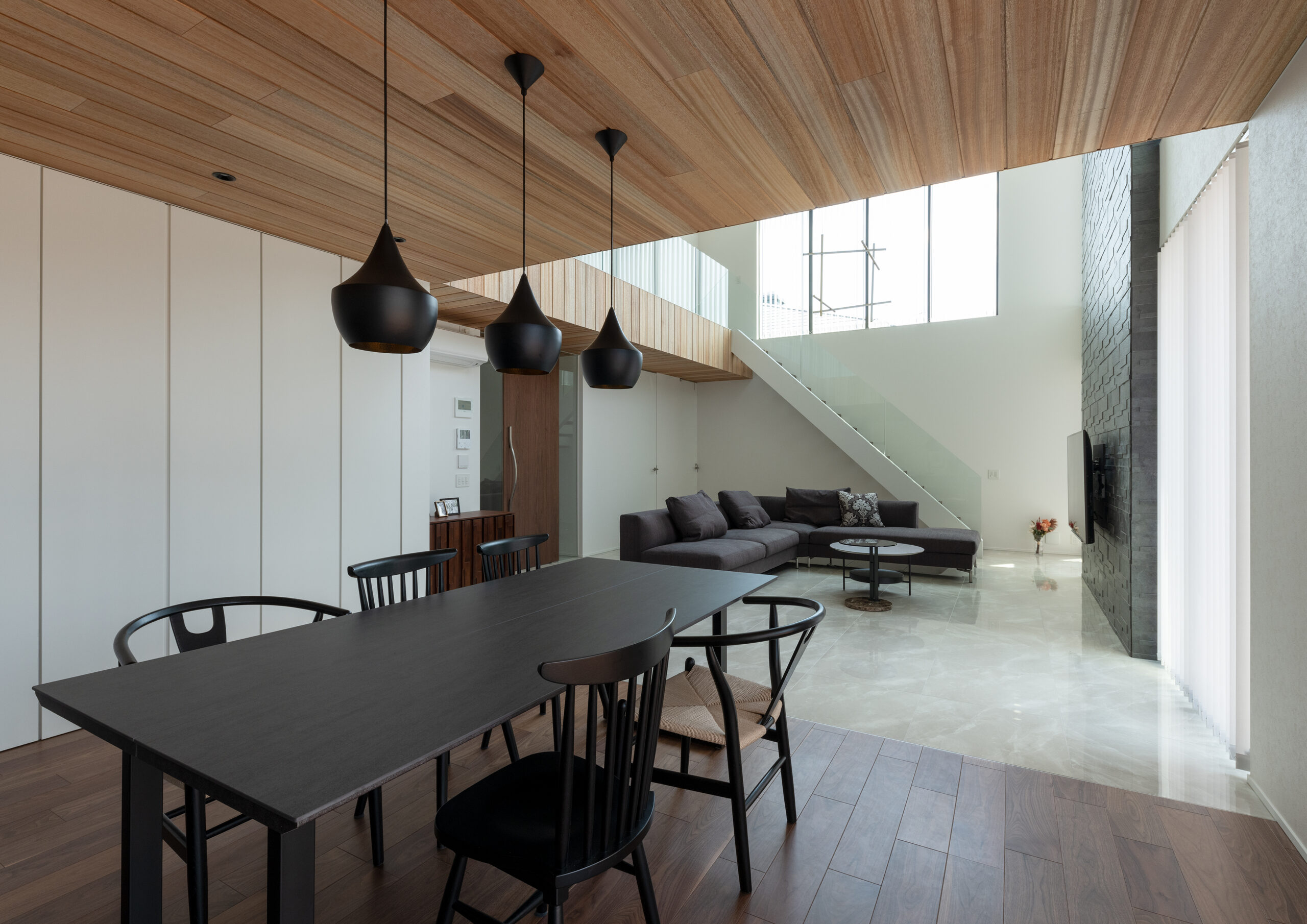 ダイニング。あえて天井高を下げ、落ち着いて食事ができる空間に。ダイニングの後ろ(写真左側)には一面の収納を配置。リビングではなくダイニングに収納があるのは、ダイニングで過ごす時間が長いというヒアリングからだ