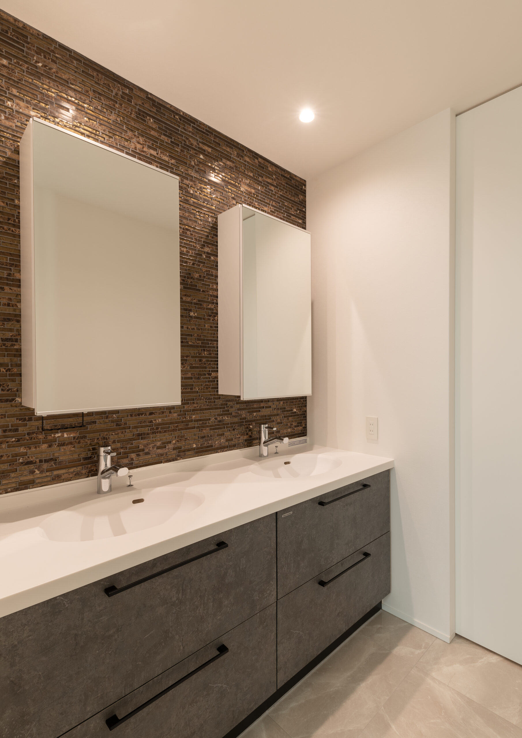造作の洗面。お客様も使うため、洗面と脱衣室を分けてドアを設置したパブリックスペース