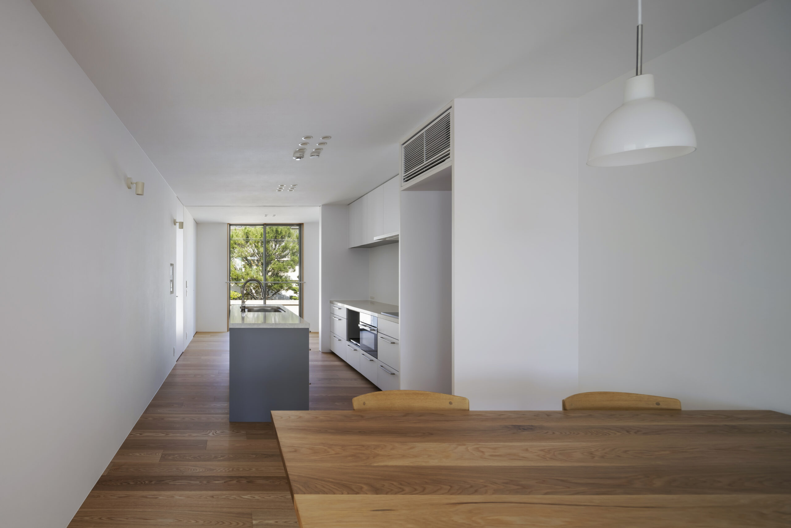 縦長のLDKにおいても十分な作業スペースを確保できるⅡ型キッチンを採用。西側に設けたパントリーは存在感を限りなく消すため、扉があると一見分からないほどフラットに仕上げた