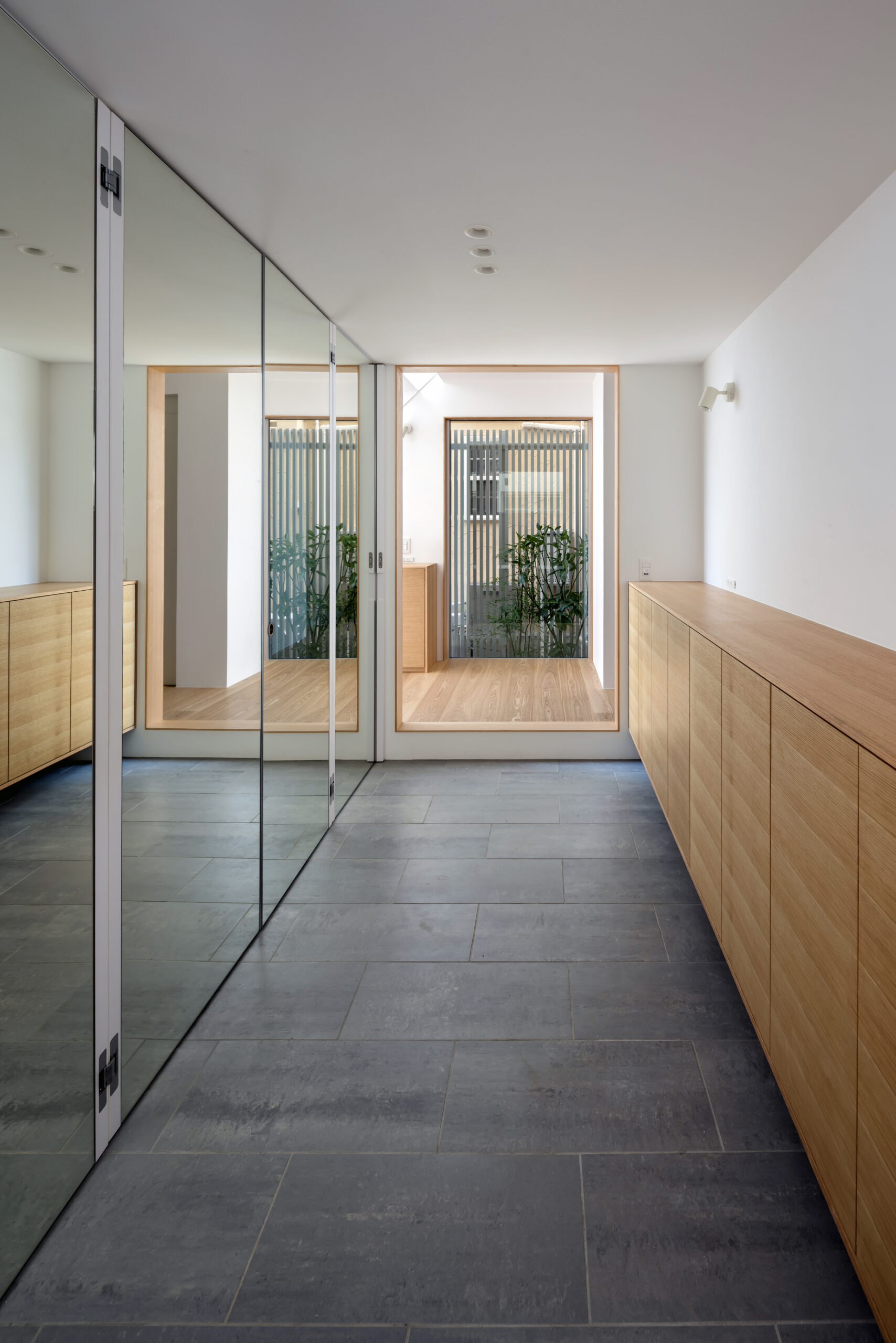 玄関から家の中に入るとまず、余白を意識したゆとりのある空間が迎えてくれる。抜け感を演出するため、突き当たりにFIX窓を設けて外の坪庭と自然光を取り込んだ