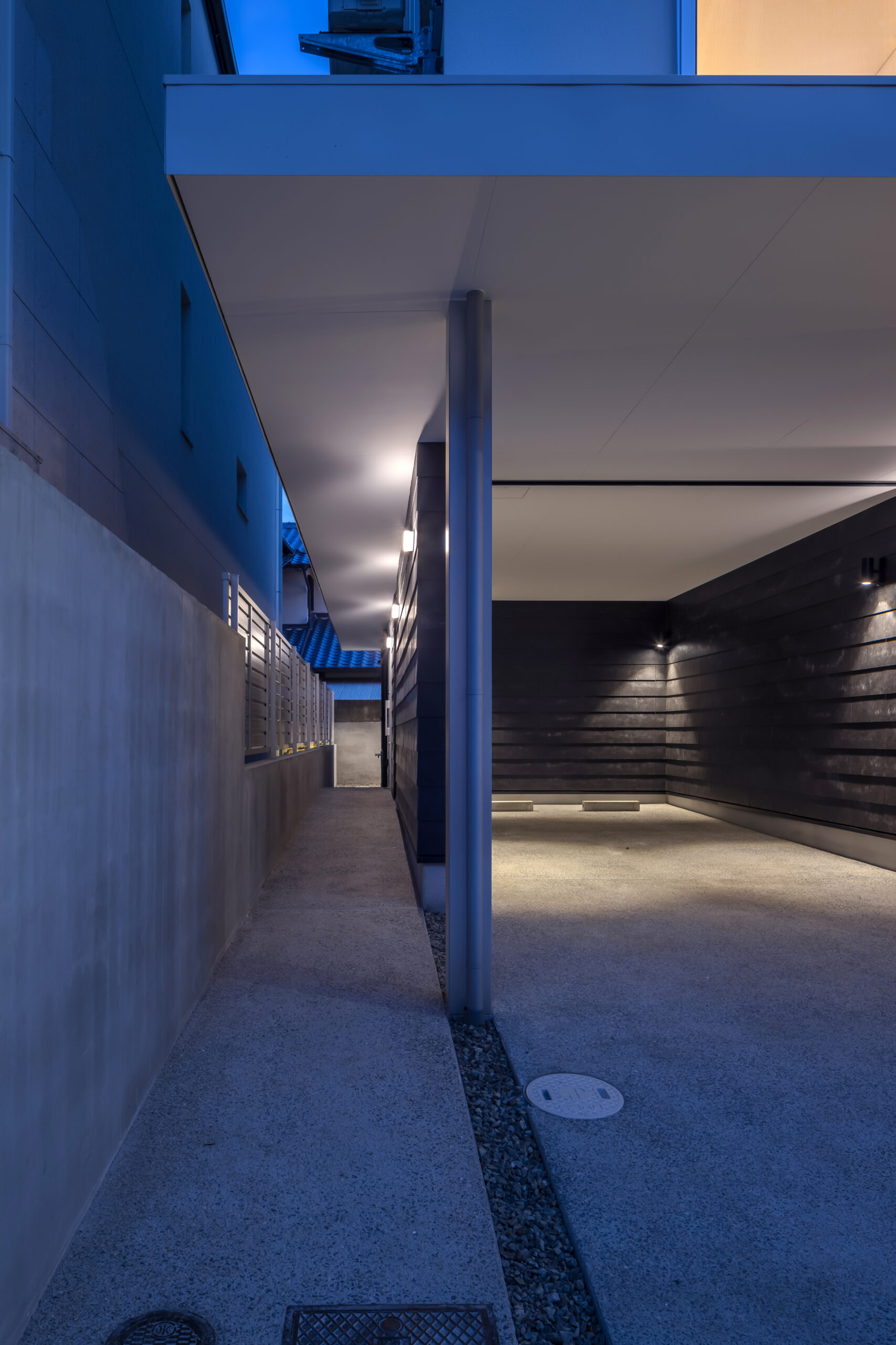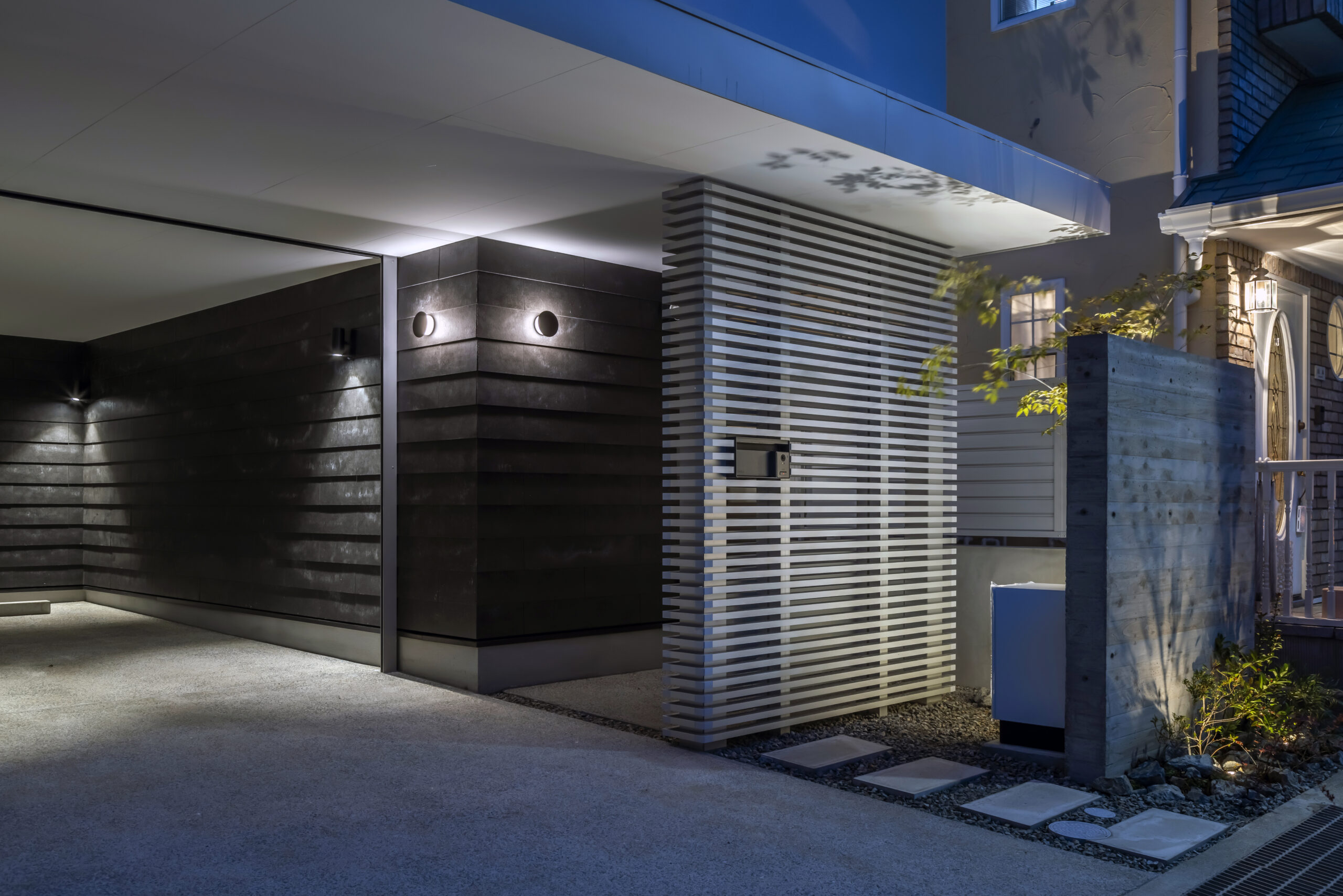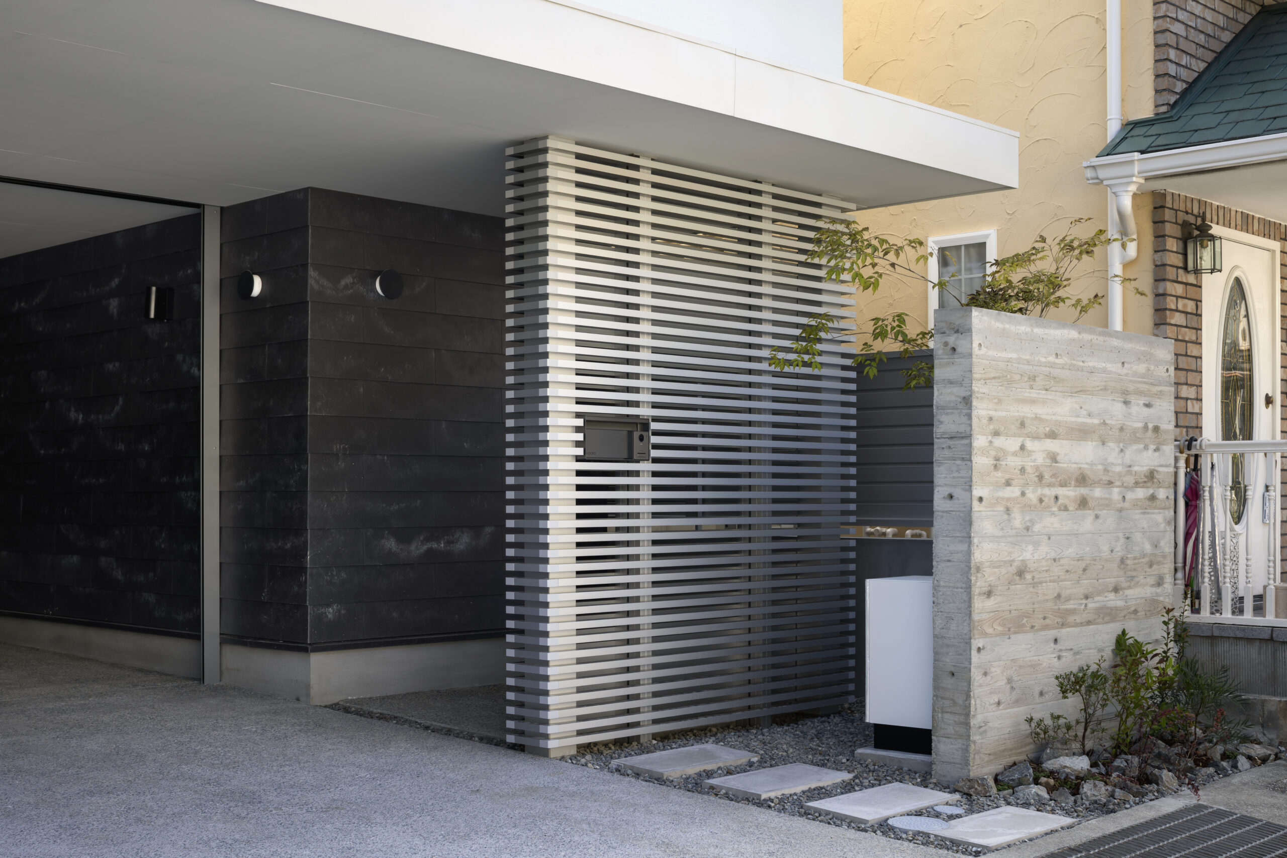 セメント素材に着色塗装をせず、素地そのものの風合いを生かす外壁材『SOLIDO』をガレージ部分に採用。経年変化で表面に生じる白華のムラも、自然の意匠ならではの味わいになる