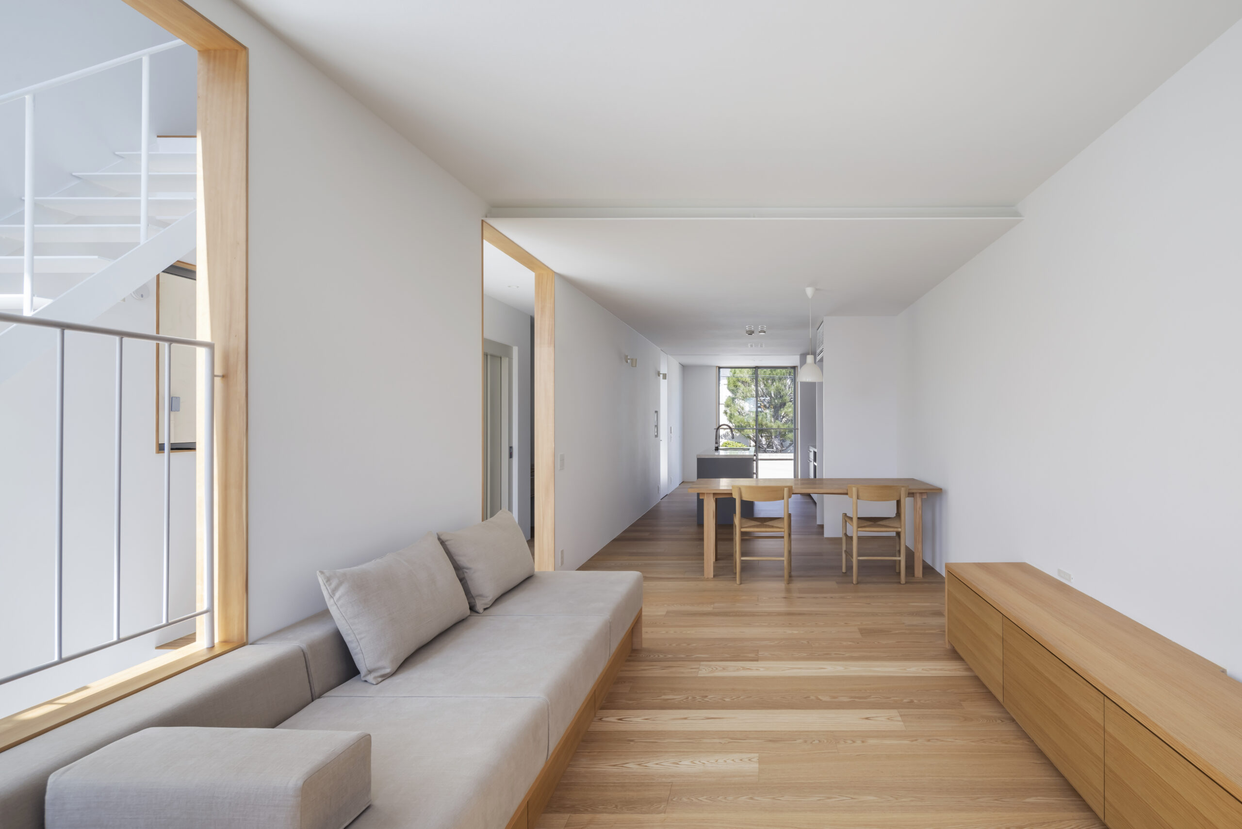 長手方向の南北にすっきりと抜けるLDK。北側のお宅の庭にある立派な樹木を借景として最大限活かせるよう、腰窓ではなくハイサッシの掃き出し窓を採用したのもこだわりだ