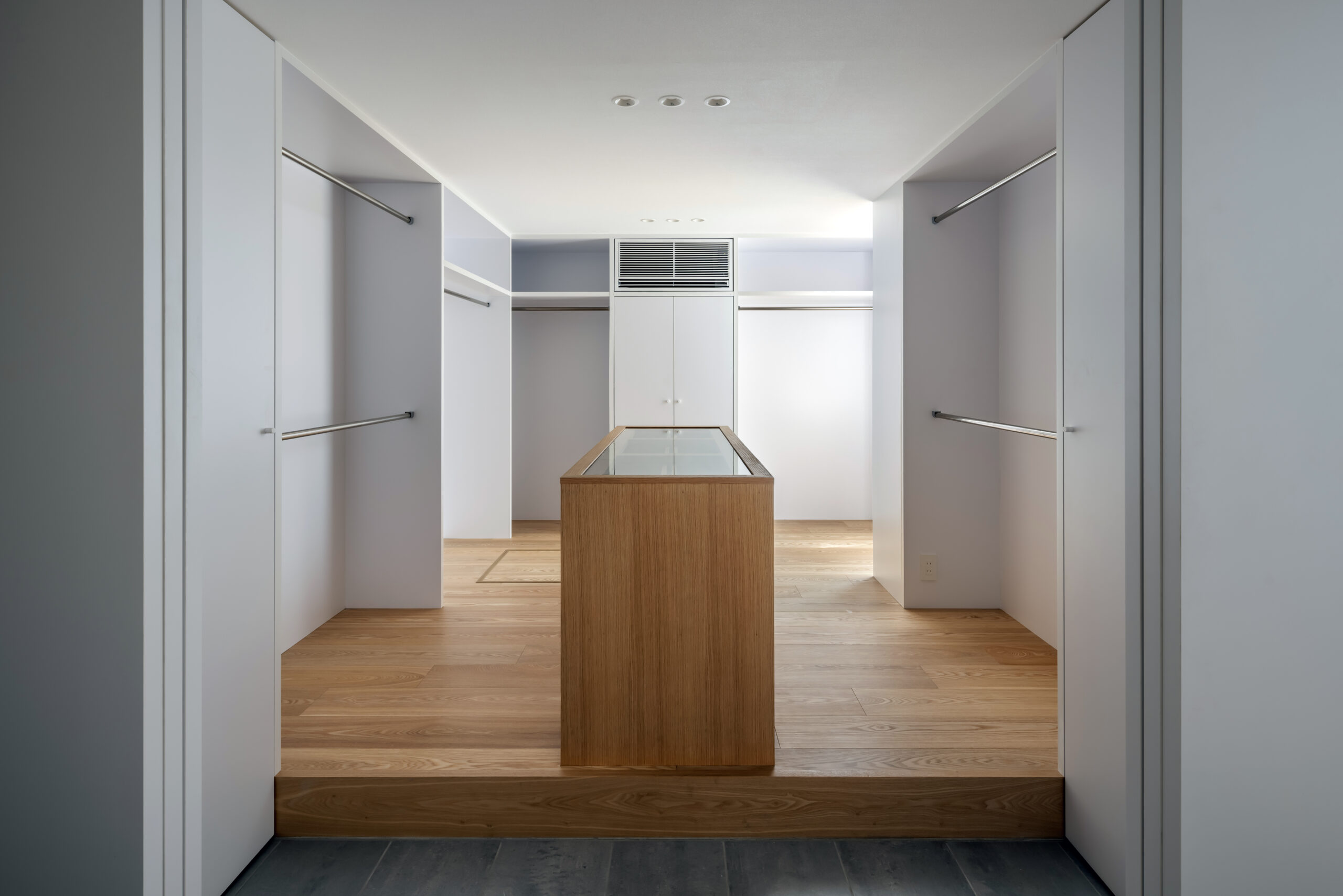 手前にシューズクローク、靴を脱いで上がった場所に造作のアクセサリーケースとハンガー収納を設えた多機能な衣装部屋。ガラスケースの下は引き出し収納になっている