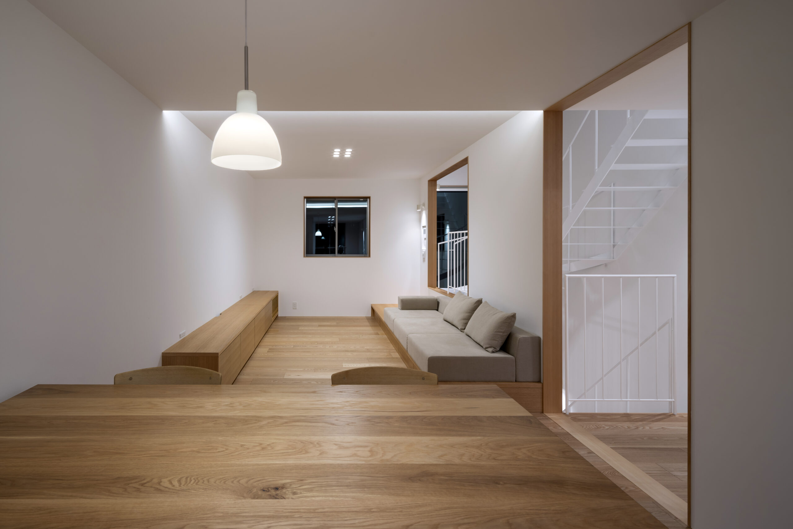 折上天井による縦への広がりや階段室との緩やかなつながりによって、面積以上のゆとりを感じられるリビング。TVボード・ソファ・ダイニングテーブルいずれも造作で設えた