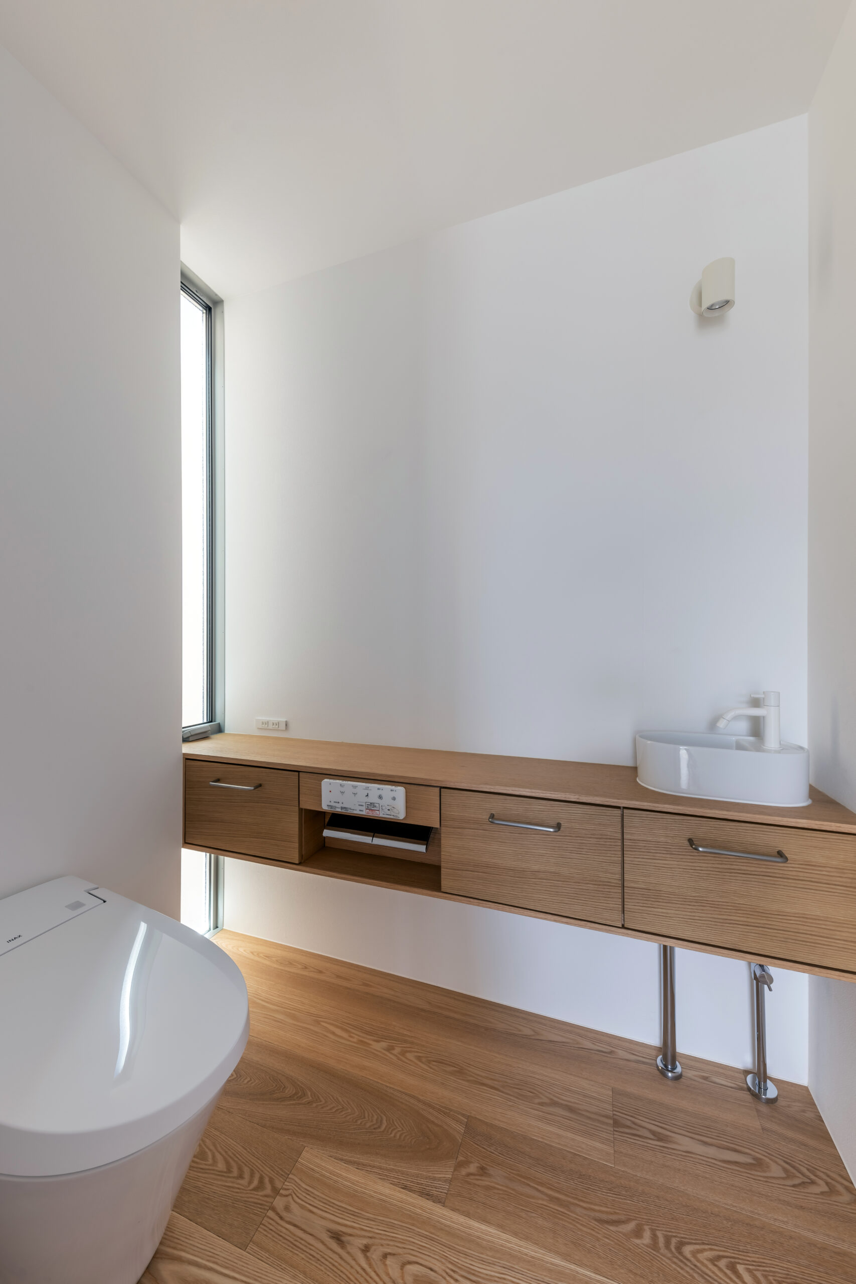 来客用の2階トイレ。手洗い・ペーパーホルダー・収納の機能を集約した造作カウンターは、窓に突き刺さるようなデザインとすることで空間の広がりと奥行を強調している