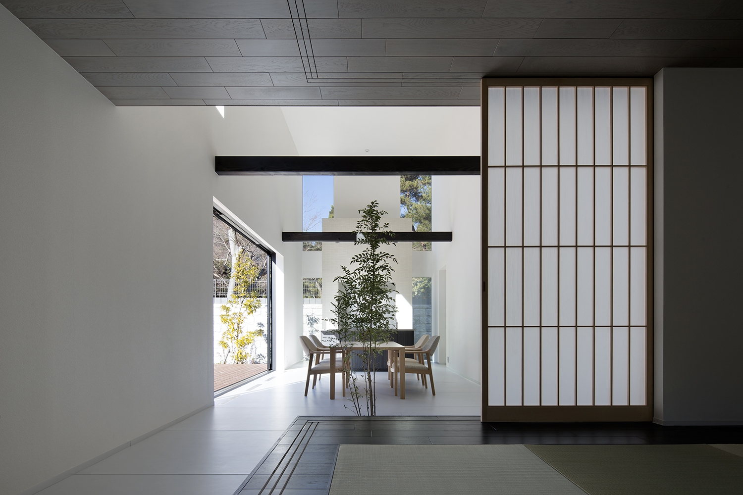 和室の障子を閉めた状態。室内にいながら、屋外から眺めているかのような印象を与える