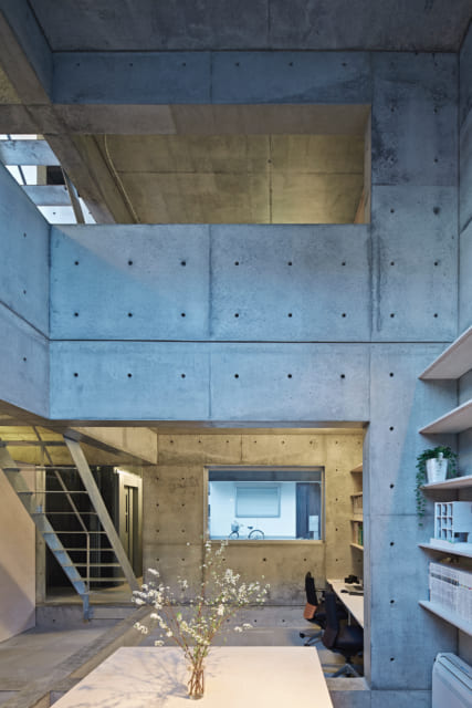 2階から1階のミーティングスペースを眺めた様子。絶妙な間隔で刻み込まれたPコンが美しい。まるでコンクリートの壁がアート作品のような印象だ