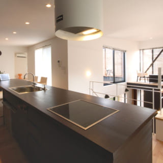 リビングは吹き抜けで、2階のダイニングキッチンと一体となった空間に。ホームシアターは2階から観ることもできる