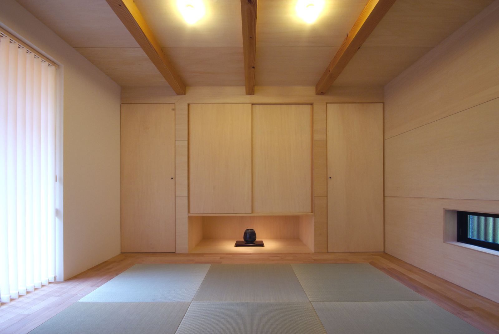 木製ルーバーの奥が住居スペース、ガルバニウム鋼板に覆われた場所が建築事務所。実験的にさまざまな窓が使用されている