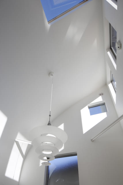 天井の光井戸。このように小窓をランダムに配置することで、光のグラデーションが室内を明るく照らすよう工夫されている