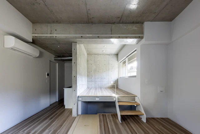 RC造がお好きで、コンクリートにガラスや木材を組み合わせた家にしたいとお考えだったお施主さま。そこで、設計を担当した藤原・室 建築設計事務所ではコンクリートの表情を室内からでも楽しめるよう、入れ子構造の家を提案。それは同時に、コンクリート打ち放しでも過ごしやすい機能性を確保するためでもあった。東京都世田谷区 / アウトドアルームのある家