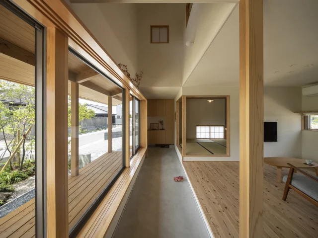 和モダンな雰囲気を持つ家を新築したいと考えていたお施主さま。依頼を決めたのはこれまでも多くの和の家を手掛けた、建築家の湊さんだ。要望を芯から理解し、デザインが洗練されているだけでなく、心地よく風が抜ける光に満ちた家を実現。鍵となったのは通り土間と深い軒、そして吹き抜けだという。福岡県柳川市 / 材木町の家