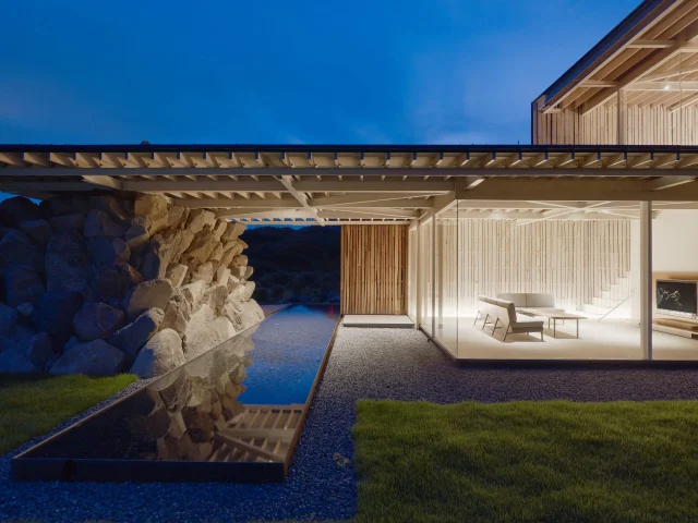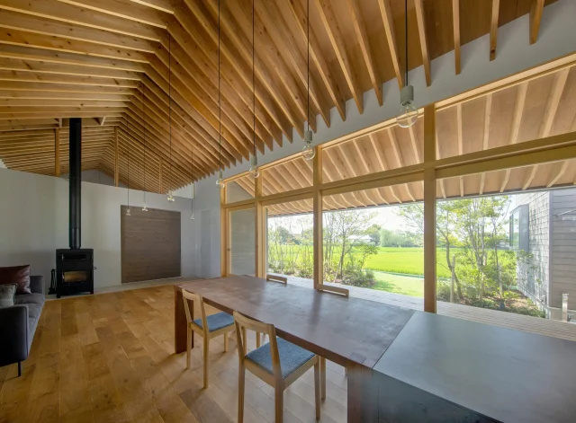 建築家の林田さんが自邸を建てるため選んだ土地は、一面に田んぼが広がる農村地帯にある。田んぼを眺めつつ生活できる平屋は、切妻屋根も美しくしっくりと風景になじんでいる。それだけではない。出入り自由、誰もが使えるパブリックスペースとして通り土間を設けるなど、本当の意味で地域に根付いているのだ。福岡県北九州市 / Rock House