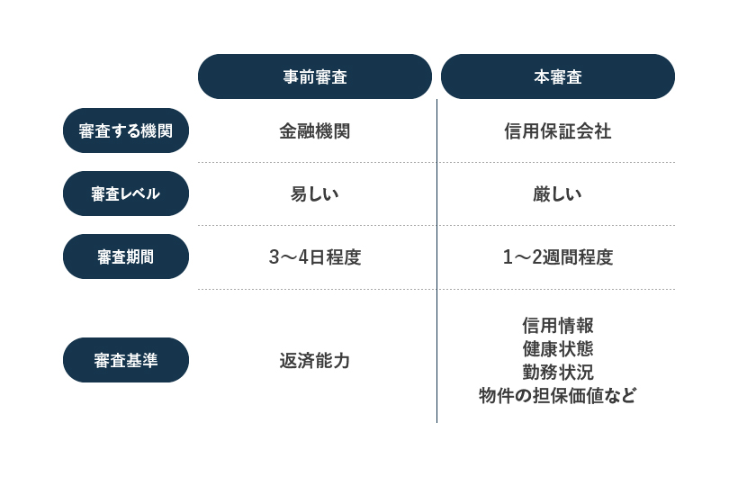 また、事前審査は銀行などの金融機関が行うのに対し、本審査は信用保証会社が行います。