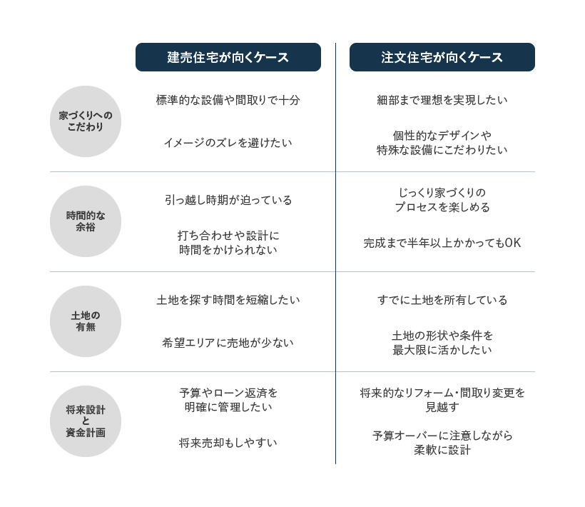 といった場合は、比較的短期間で入居できる建売住宅のほうが現実的な選択となることもあります。