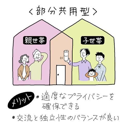 玄関やリビングなど一部を共有しつつ、キッチンや水まわりは分けるなど、世帯ごとにプライベート空間を確保するスタイルです。