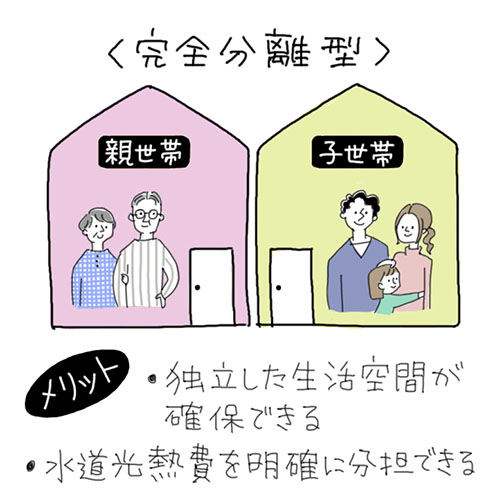 上下階で分ける「上下分離型」や、左右に分ける「左右分離型」などがあります。 建築コストは高めになりますが、それぞれの生活を尊重しやすいという特徴があります。