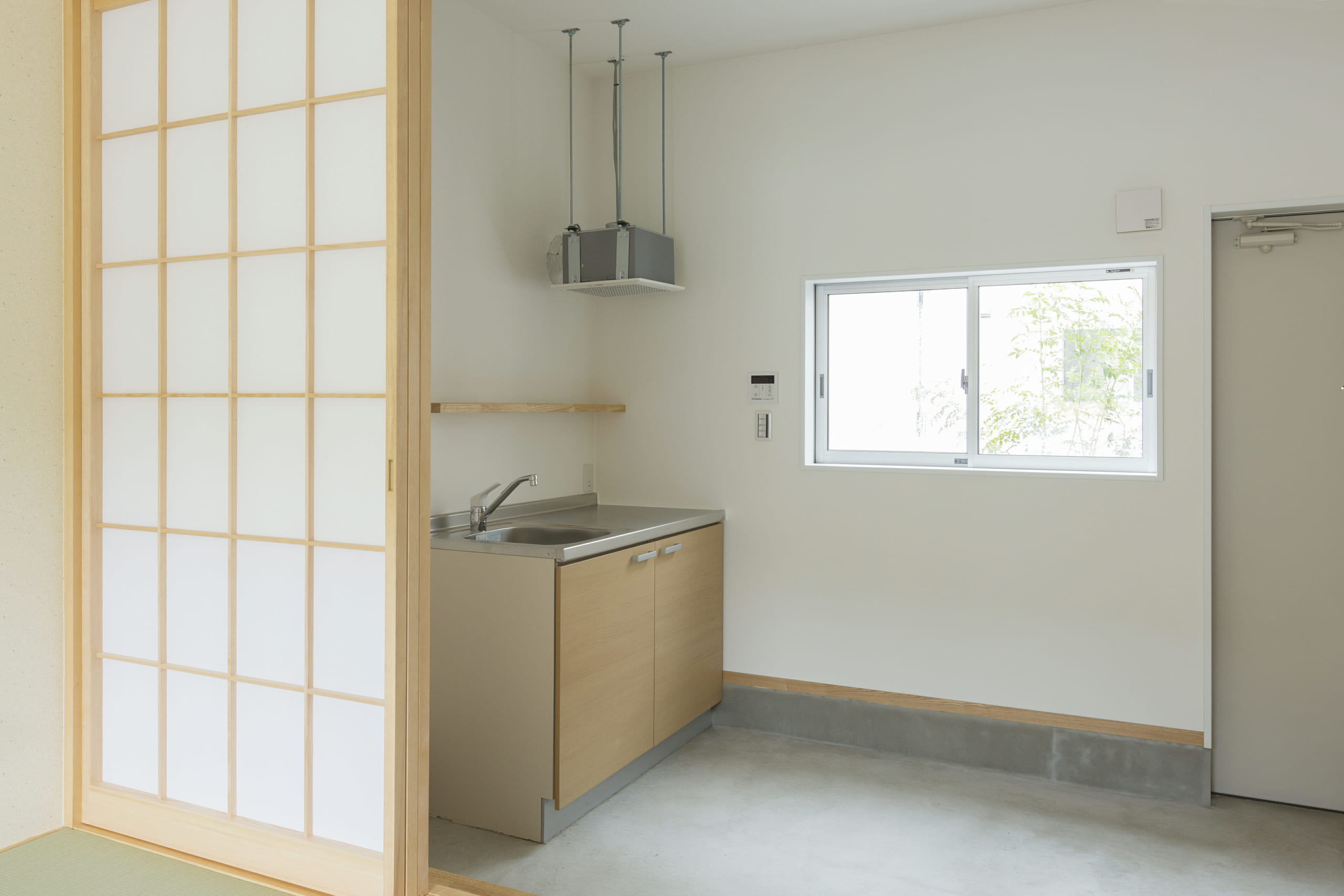 105号室。琉球畳の洒落た和室で床座の生活ができる。右奥の玄関ドアを開けるとほかの学生さんも通る中庭なので、広い土間をつくって中庭と住空間の距離を確保した
