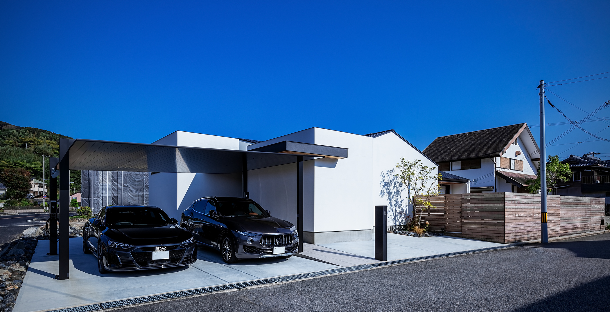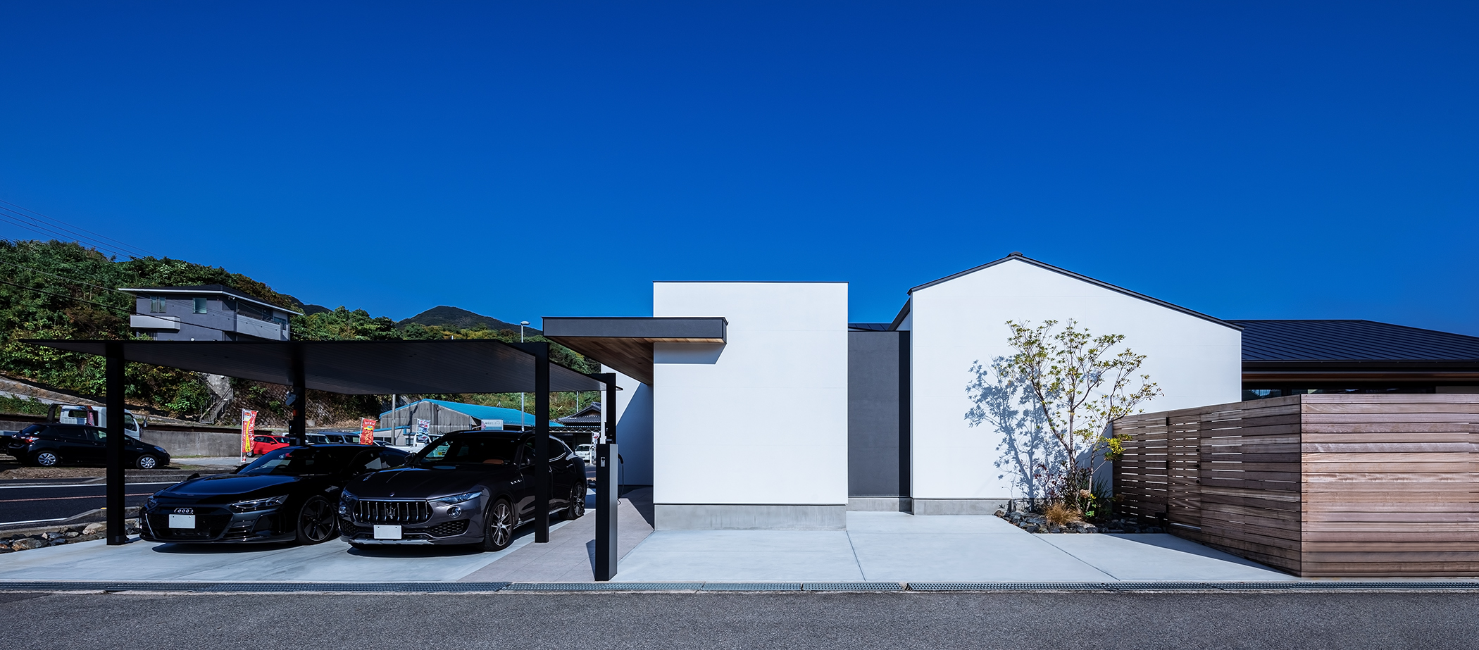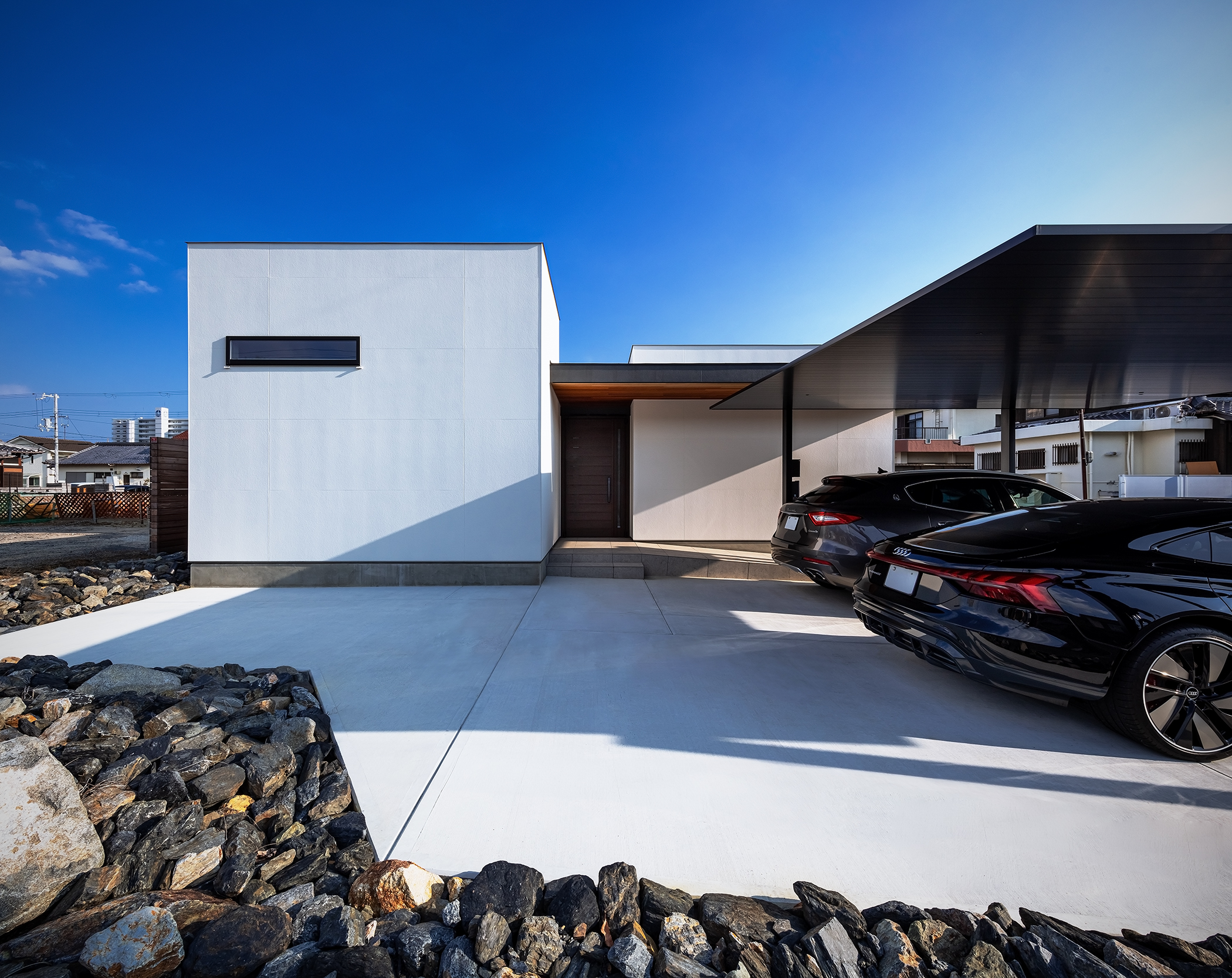 幹線道路側、西面の外観。中央の扉は玄関。左の白い箱はゲストルーム。ゲストルームの裏には小さな中庭を計画、家の内部に光を届けている。中庭をつくる余白を生む表現ができるのも平屋ならではの利点のひとつ、と石さん。庭に面した南側とは建物の見え方が異なるのもおもしろい