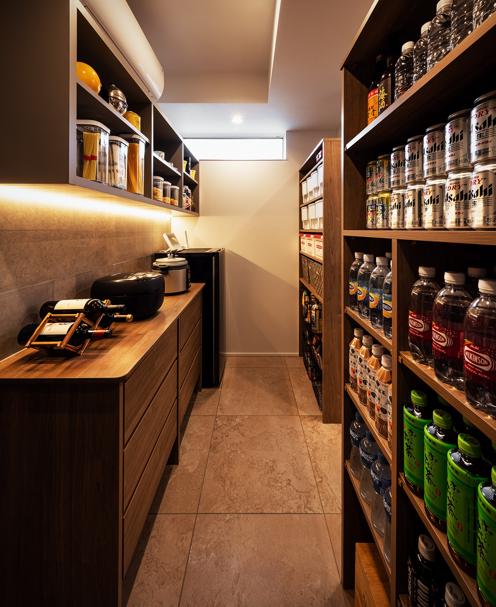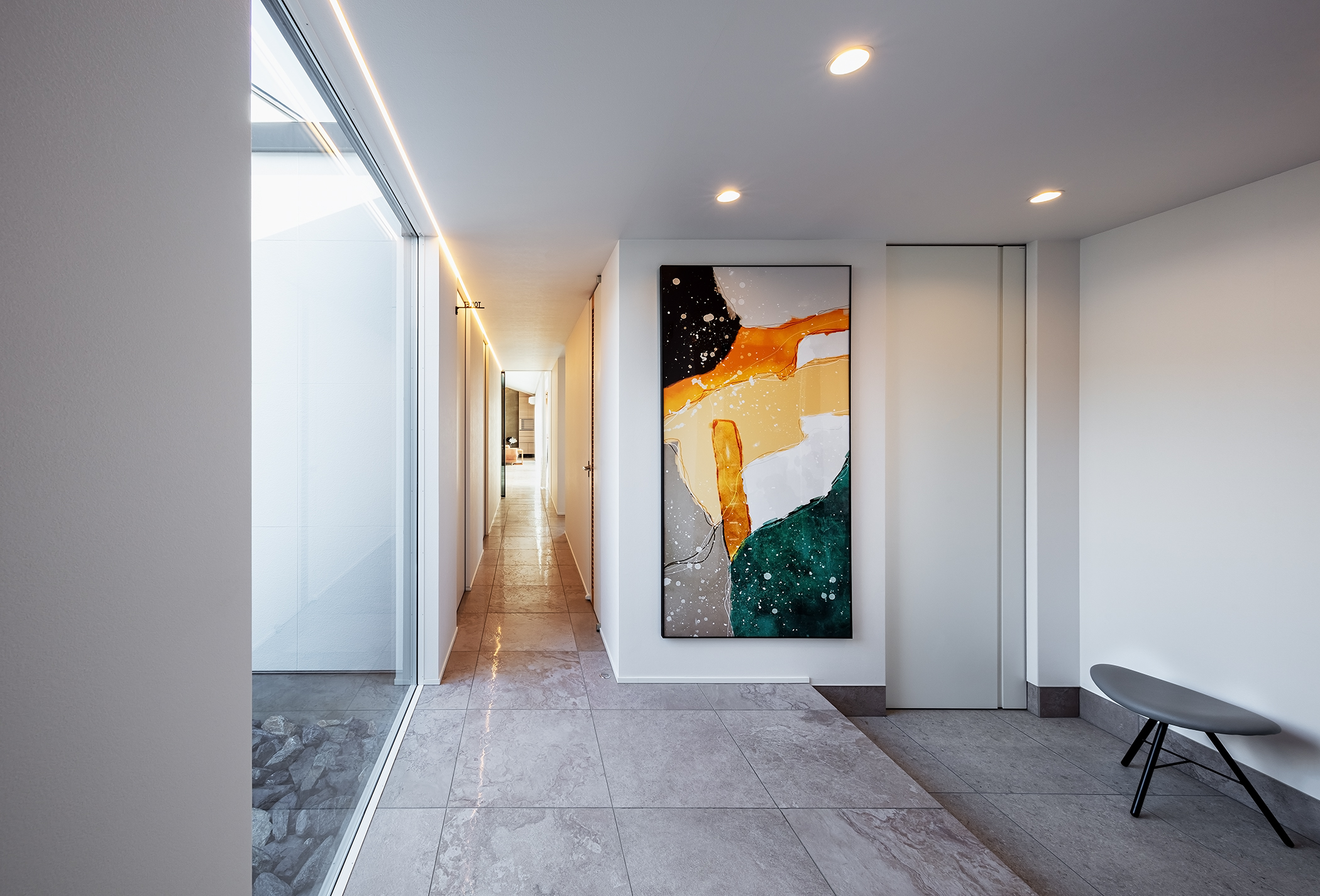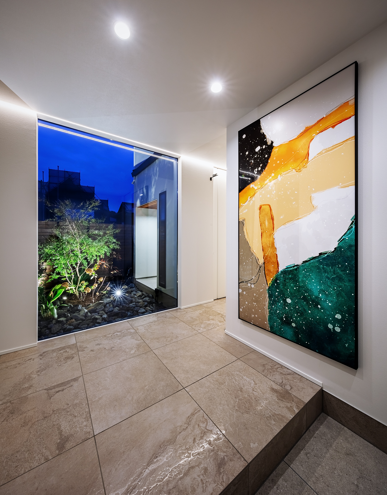 家に合わせ、玄関も広々と計画。家に入った瞬間に前面の開口から中庭が目に入り、贅沢な家だと感じられる