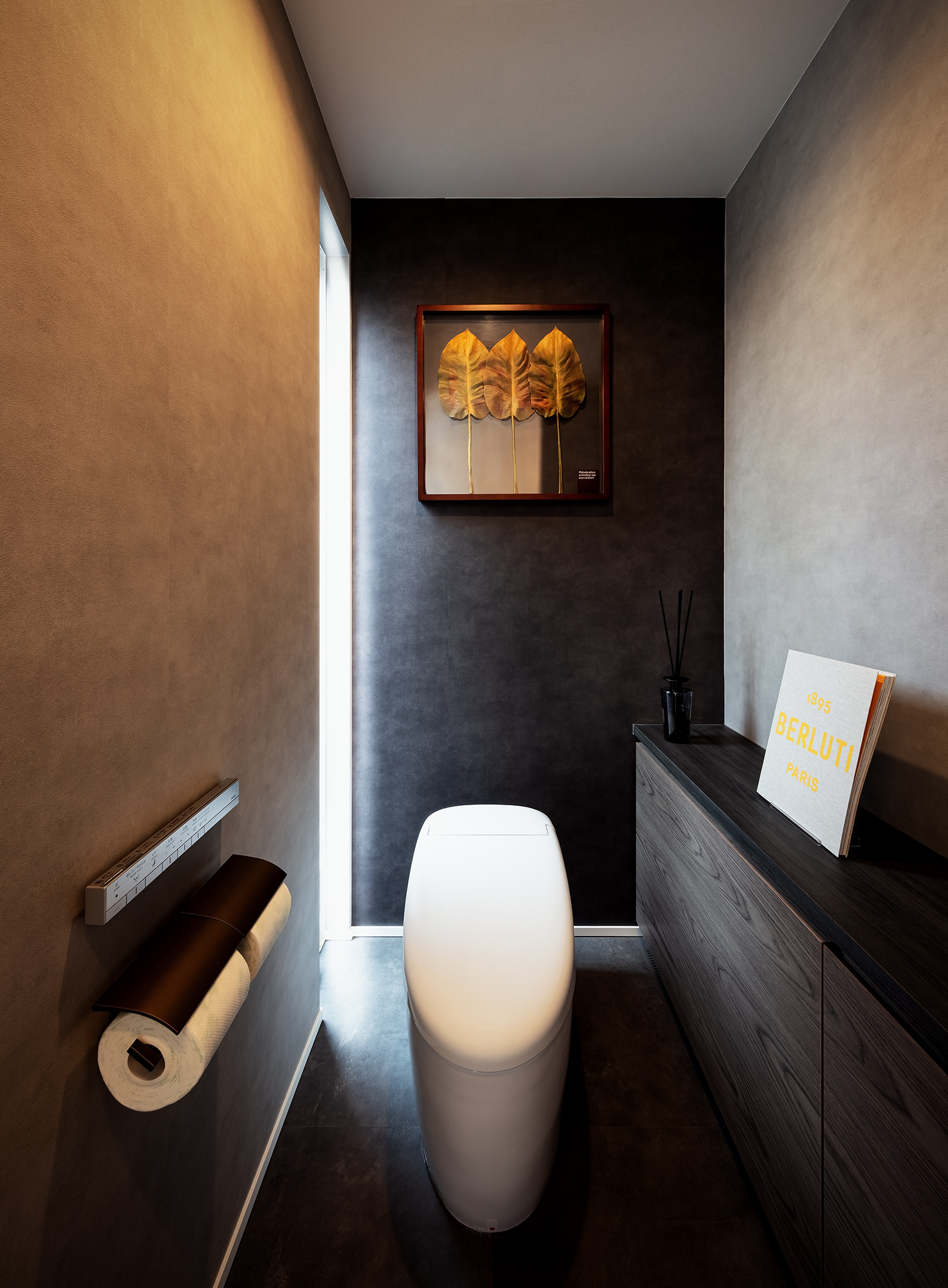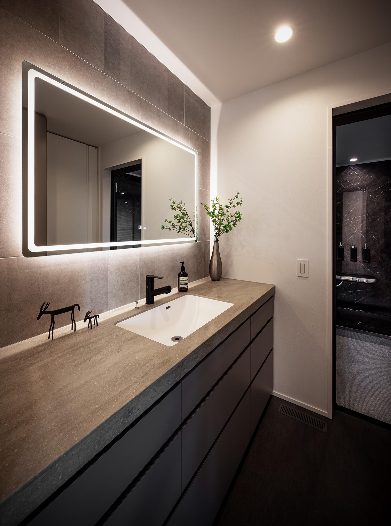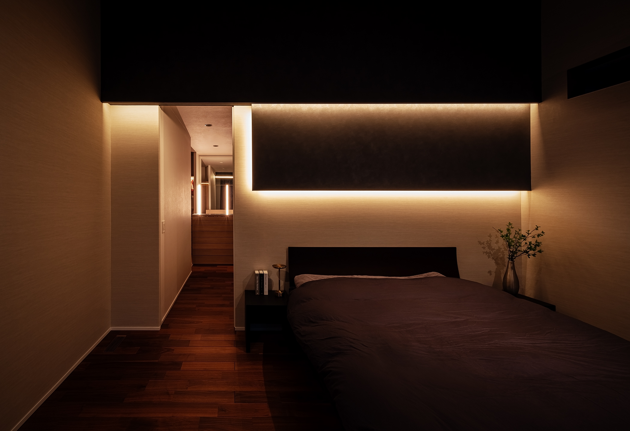 主寝室。床や壁に暗目の色を選び、夜間は高級感あるしっとりした雰囲気を楽しめるようにした。奥へ進むとシューズクローゼットやウォークインクローゼットに直接アクセスできる。背面は広々とした庭があり、LDKまで見通せる。自分の家を眺めくつろぐひとときは贅沢極まりない