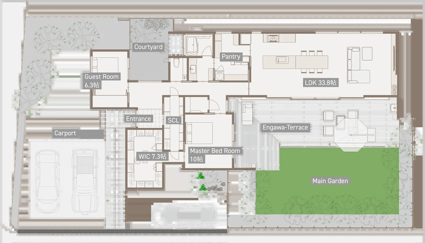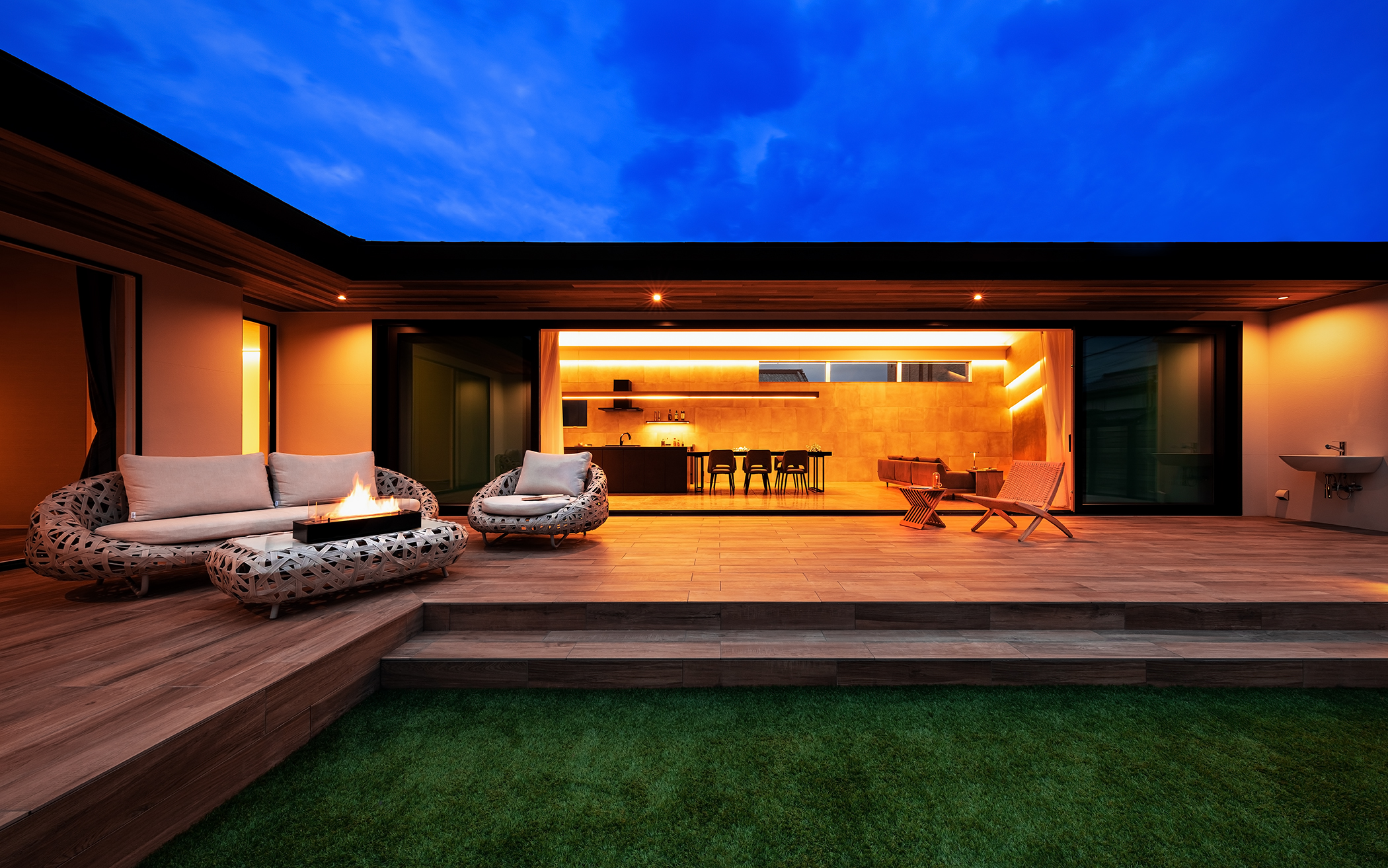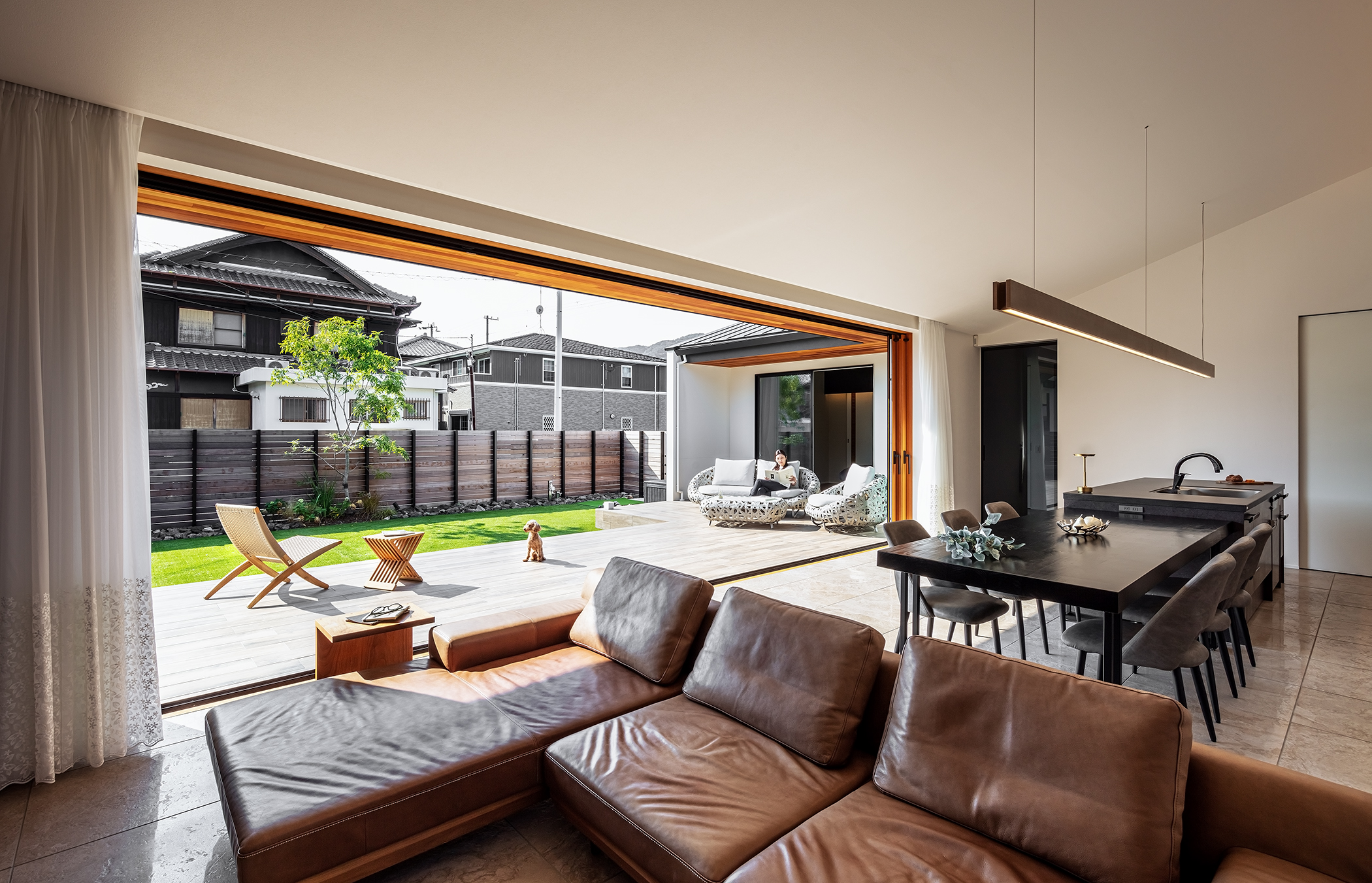 LDKから庭を見る。柱ひとつない大開口は平屋だからこそ実現した。テラスの幅が広く、リビングの一部としても捉えられるためさらなる広さが実感できる。庭に面した道路は交通量が少なく静か