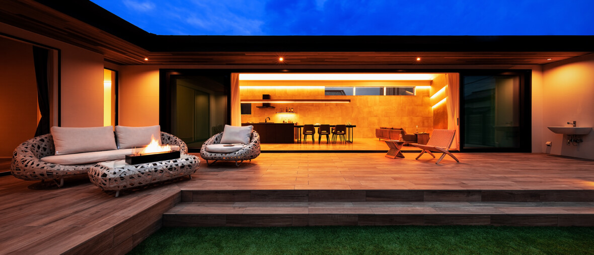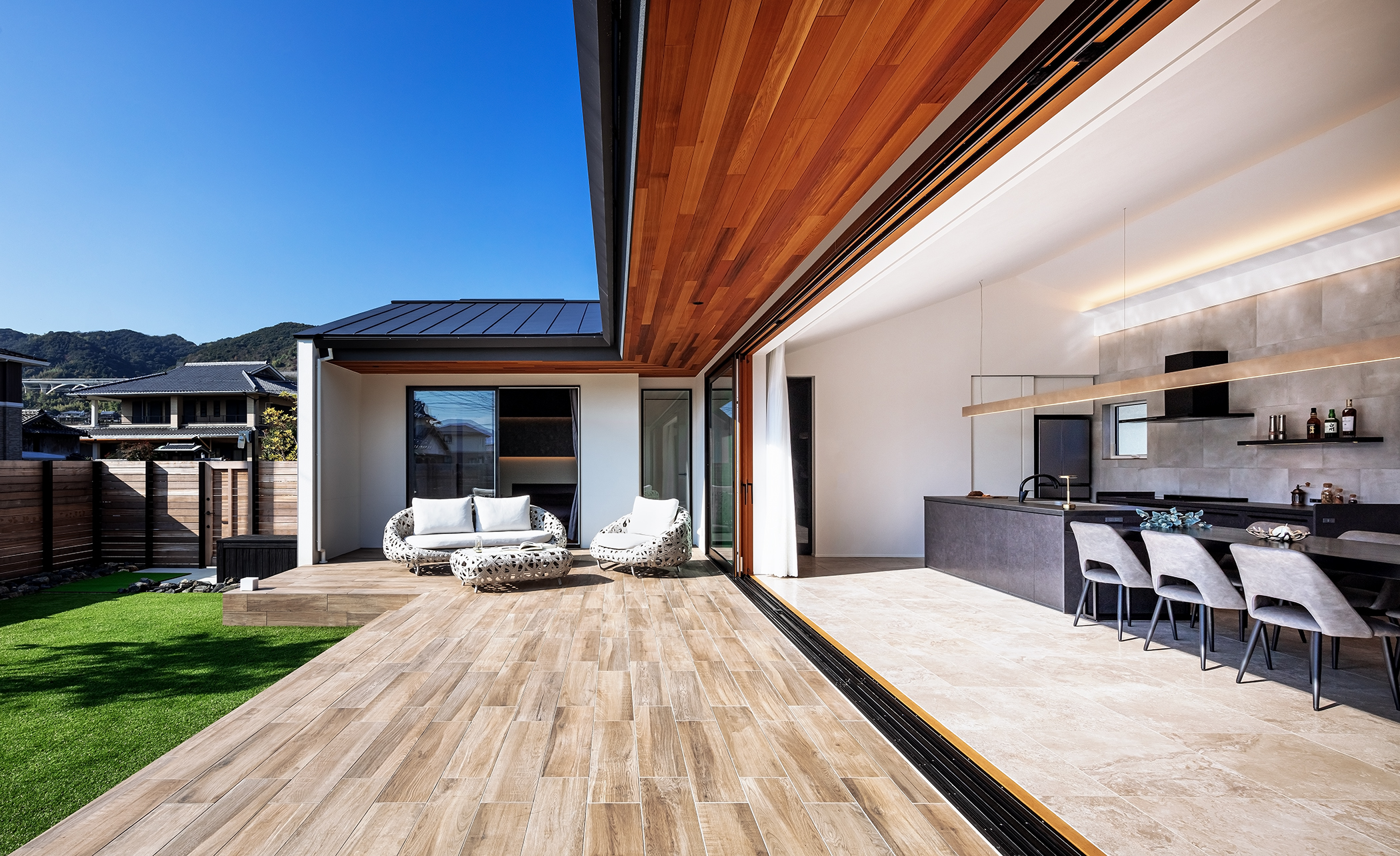 L字のテラスからLDKや庭を見渡す。正面は主寝室。テラスに張り出した庇は季節ごとの太陽高度を計算したうえで深さを計画。LDKも主寝室も一年を通して過ごしやすい。テラスは木目調パネル、LDKの床はタイルを取り入れたおかげで掃除しやすく、庭との行き来が気軽になった