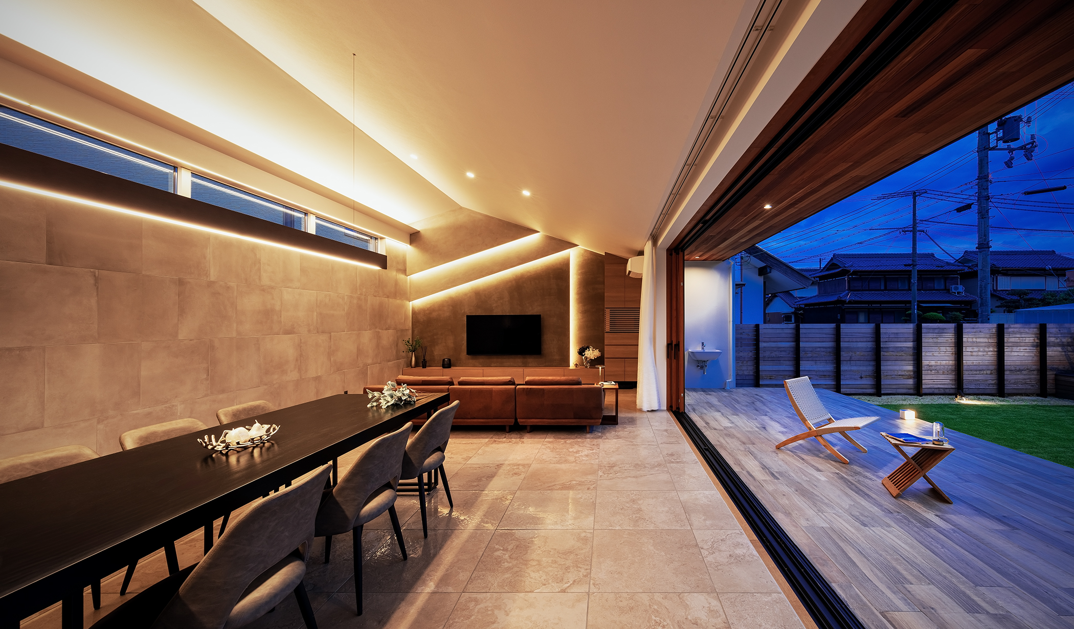 LDK(左)、テラス(右)。勾配天井は最高3.7mの天井高があり、開放感抜群。天井に極力照明を設けず、ライン状に配置した間接照明によって明るさの確保とデザイン性を両立させた