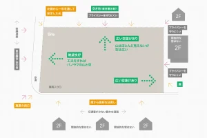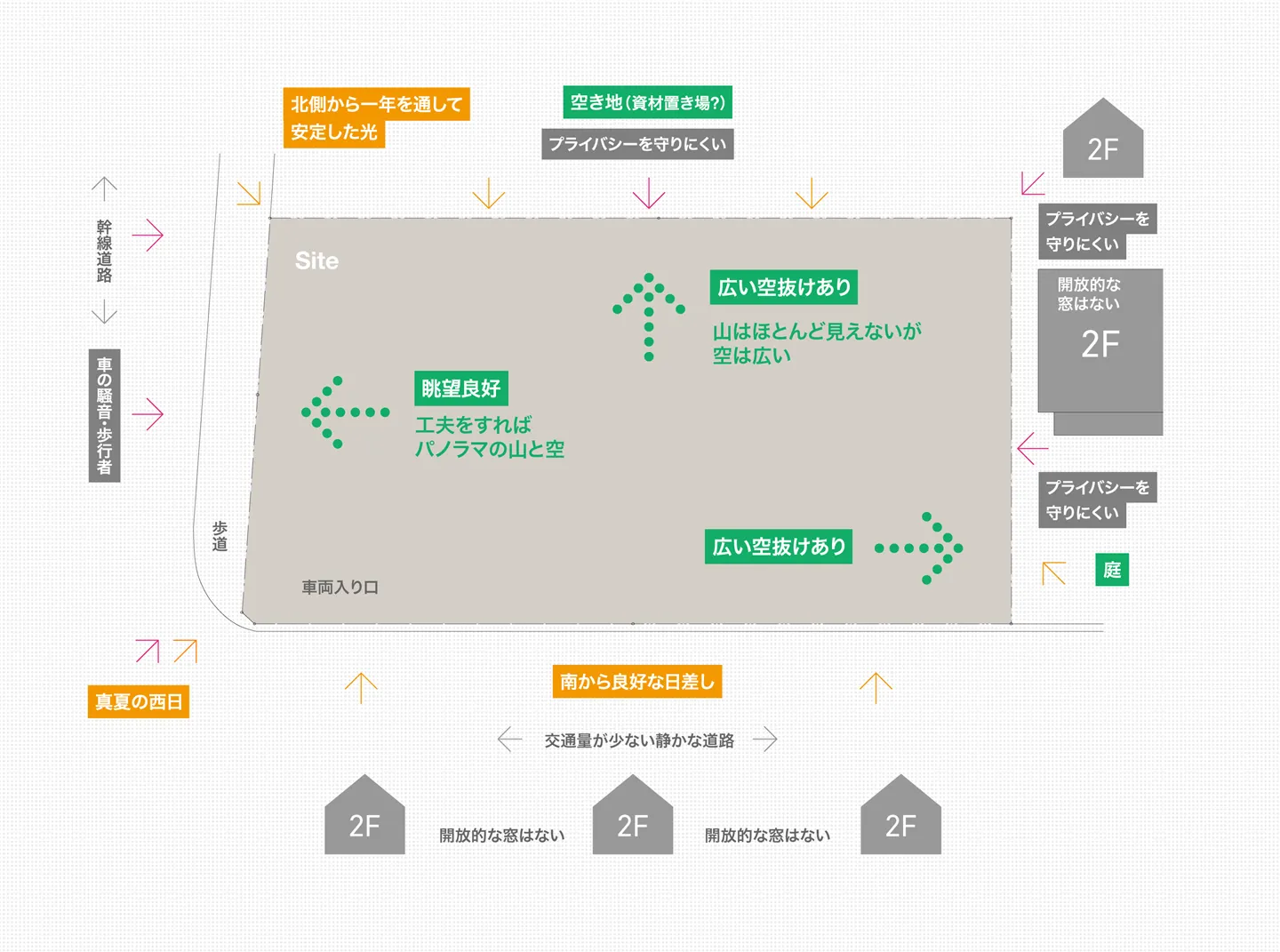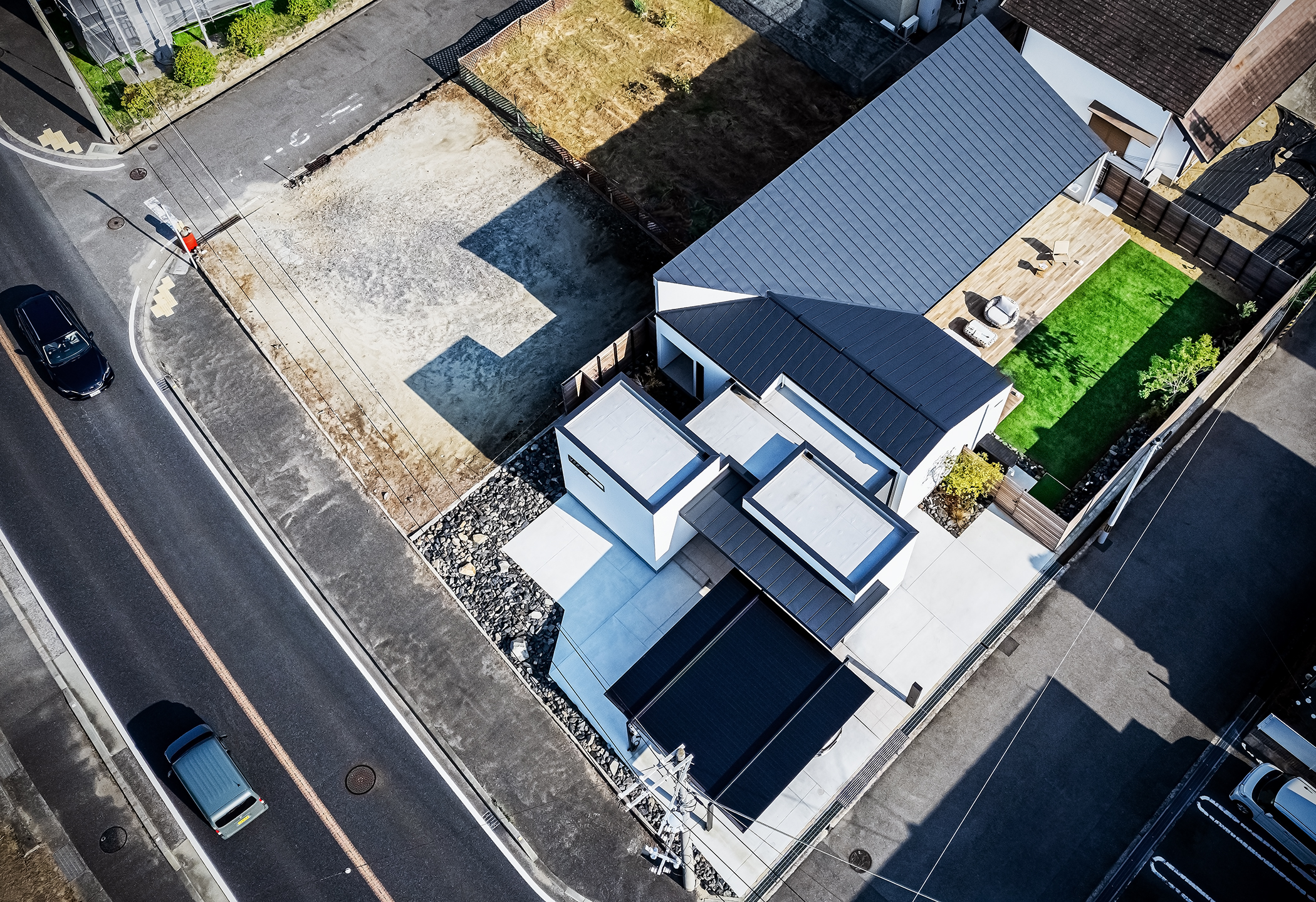 外観。画像左に走るのが幹線道路。手前の道路は交通量が少なく南にあたるため、庭は高さ2mのウッドフェンスで囲った南東(画像右)に配置した。豊かに光を取り入れながら視線や騒音を遮っている。さらに、庭の西側に建物を置いたことで、西日もコントロールできるようになった