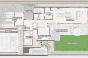 家を上空から見る。クローゼット、ゲストルーム、水回り、居住空間とエレメントごとに分け、それぞれを収めた箱を組み合わせたフォルム。それによってできた余白に大小2つの庭を計画した。黒い屋根部分が寛ぎの場。左に走る幹線道路から離し、プライバシーを確保した