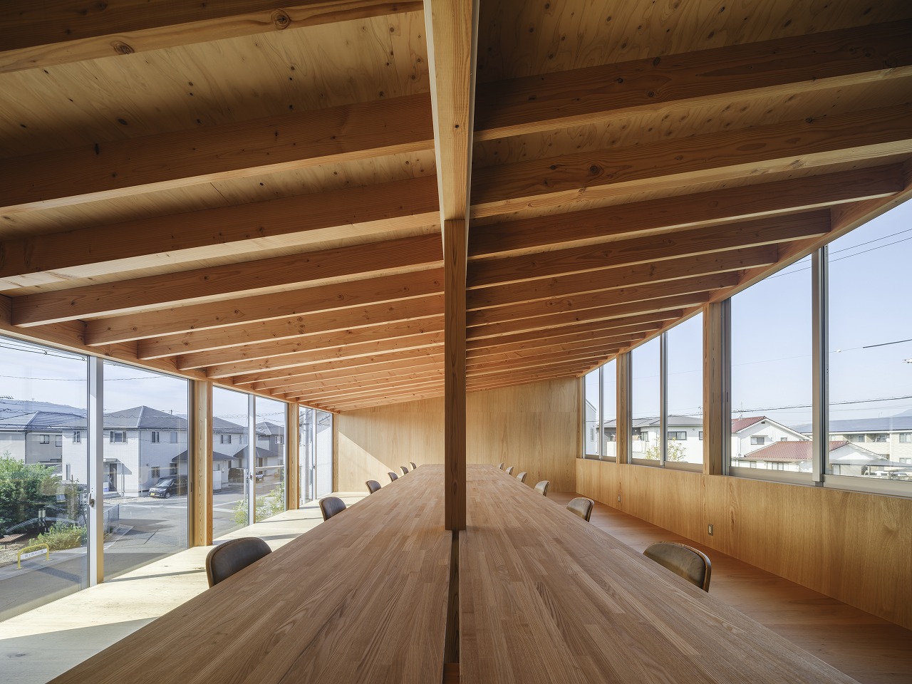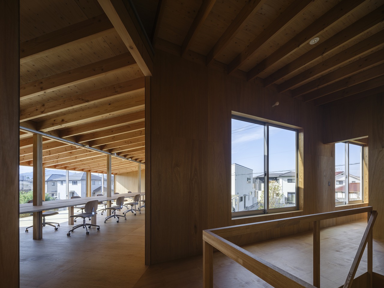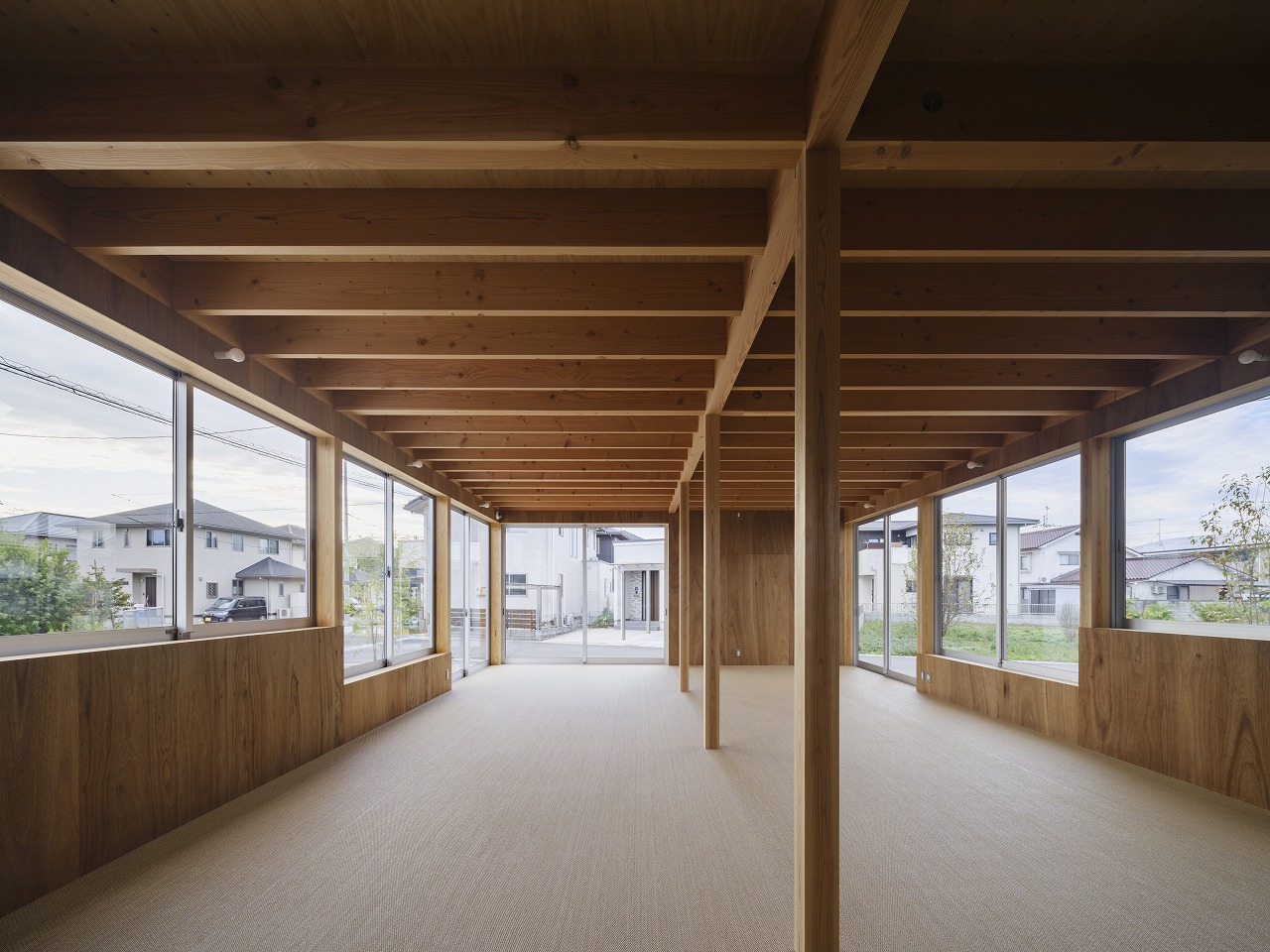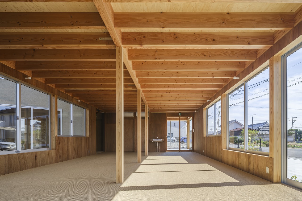 1階、機能訓練室、2階、事務室。デイサービスだけでなく、施設全体をオープンな雰囲気にしたかったと橋本さん。窓に向かって真っすぐ伸びる梁が、素直に街と向き合いたいという思いを表現している