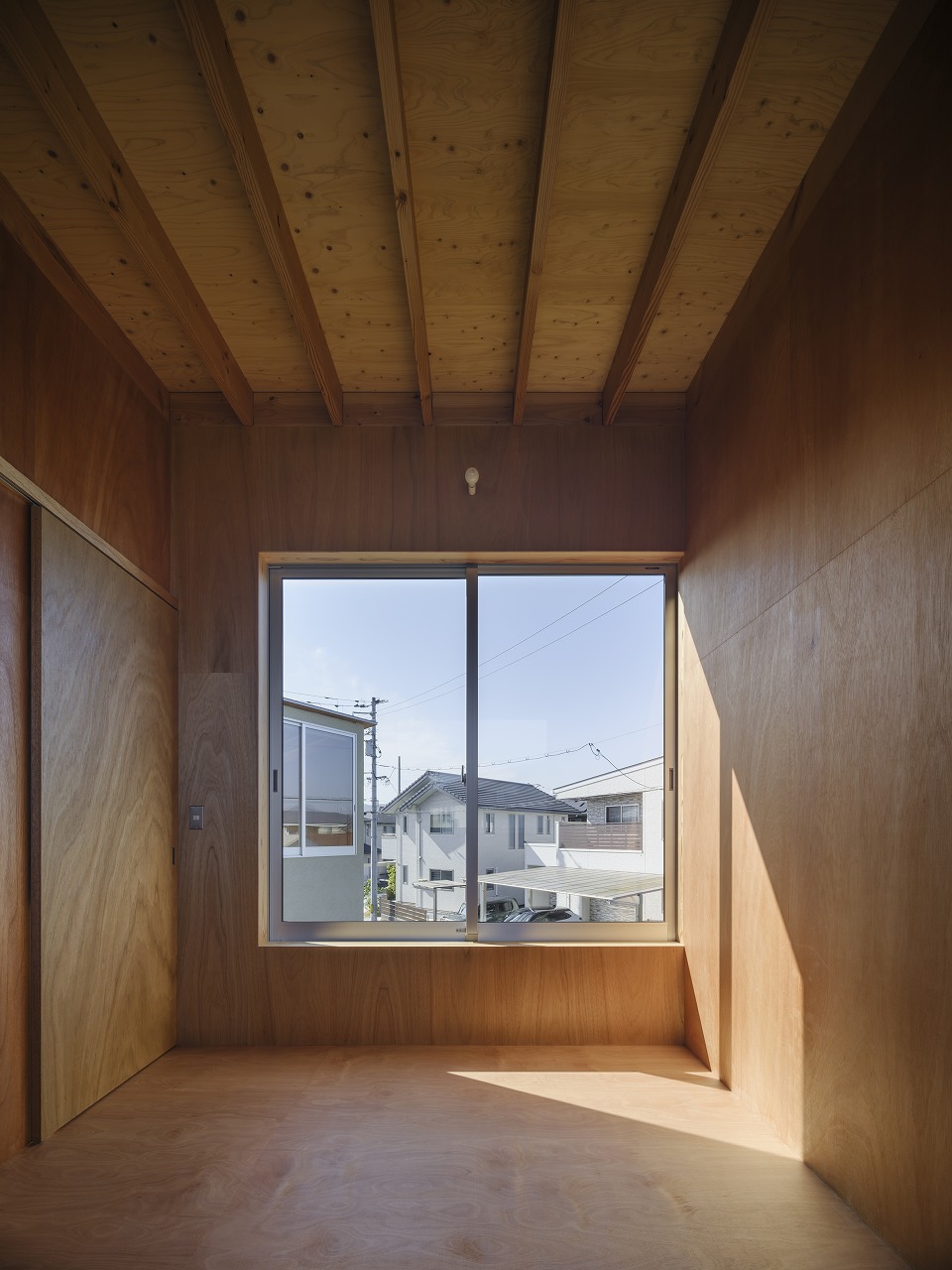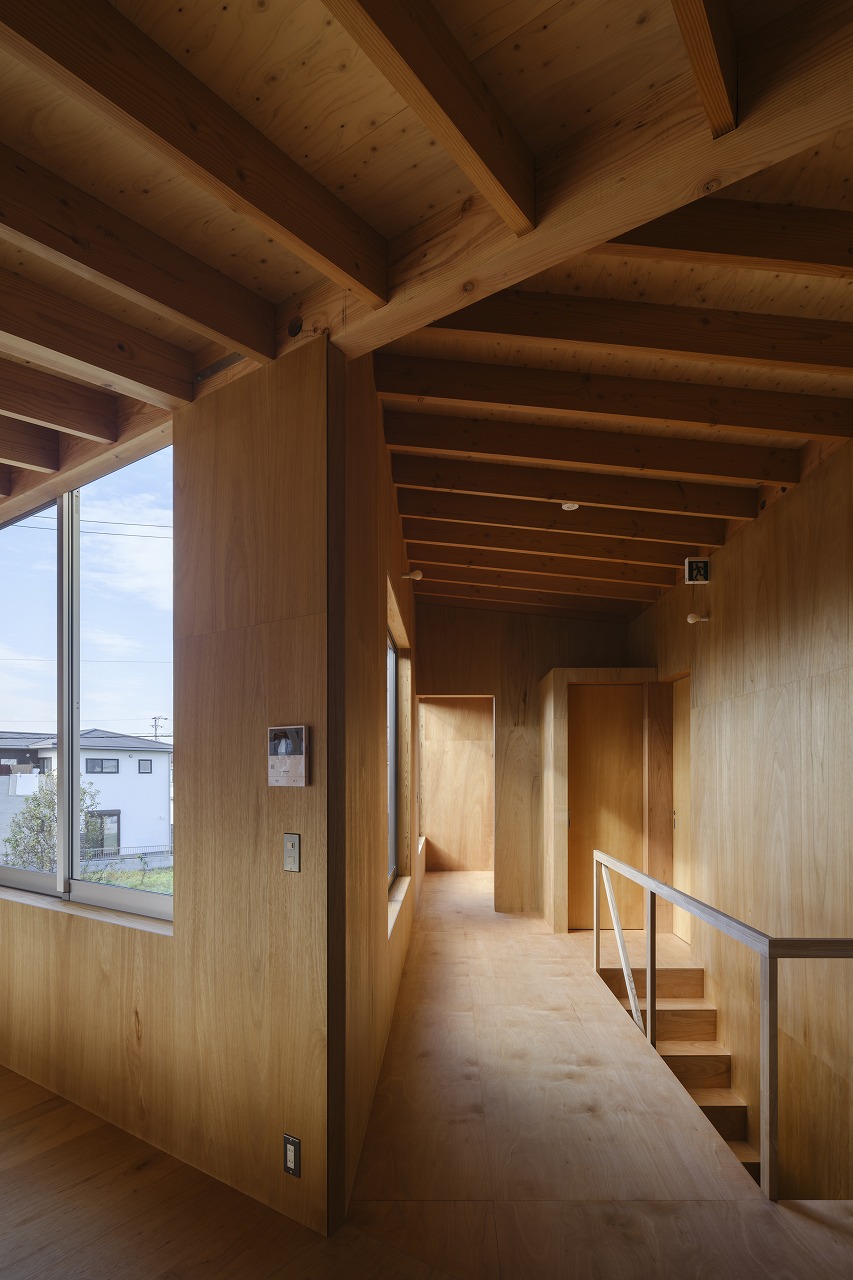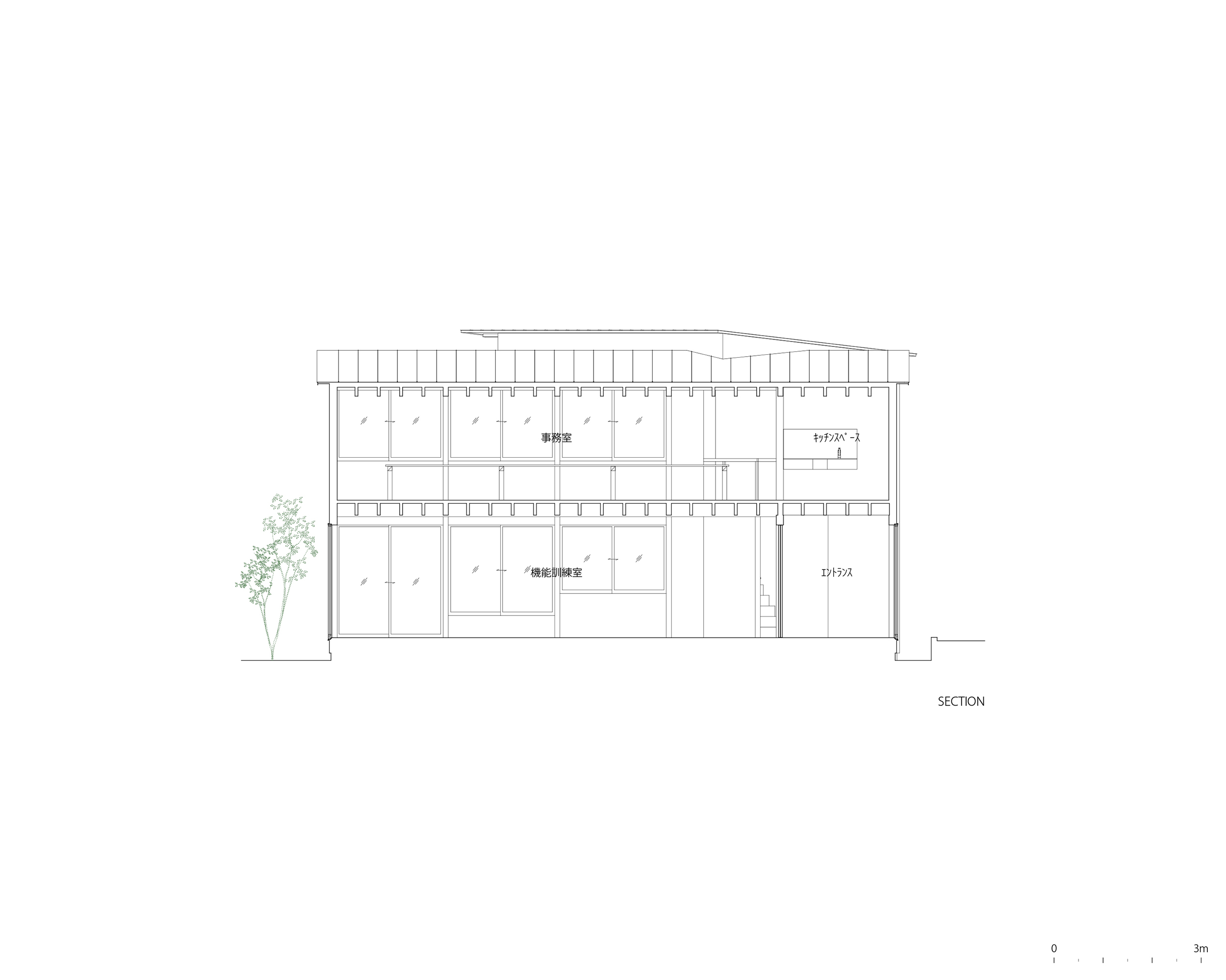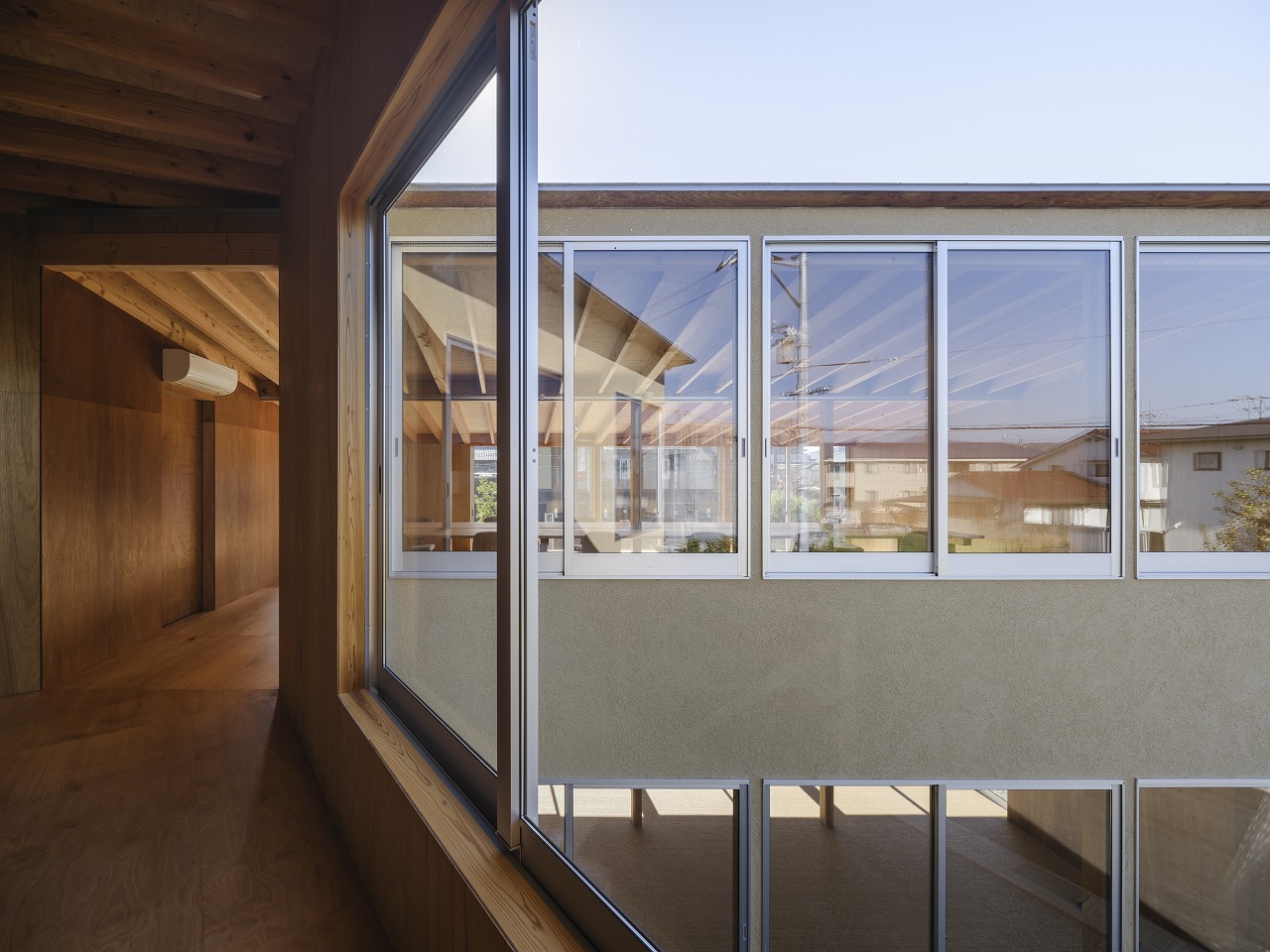 1階、機能訓練室、2階、事務室。デイサービスだけでなく、施設全体をオープンな雰囲気にしたかったと橋本さん。窓に向かって真っすぐ伸びる梁が、素直に街と向き合いたいという思いを表現している