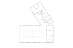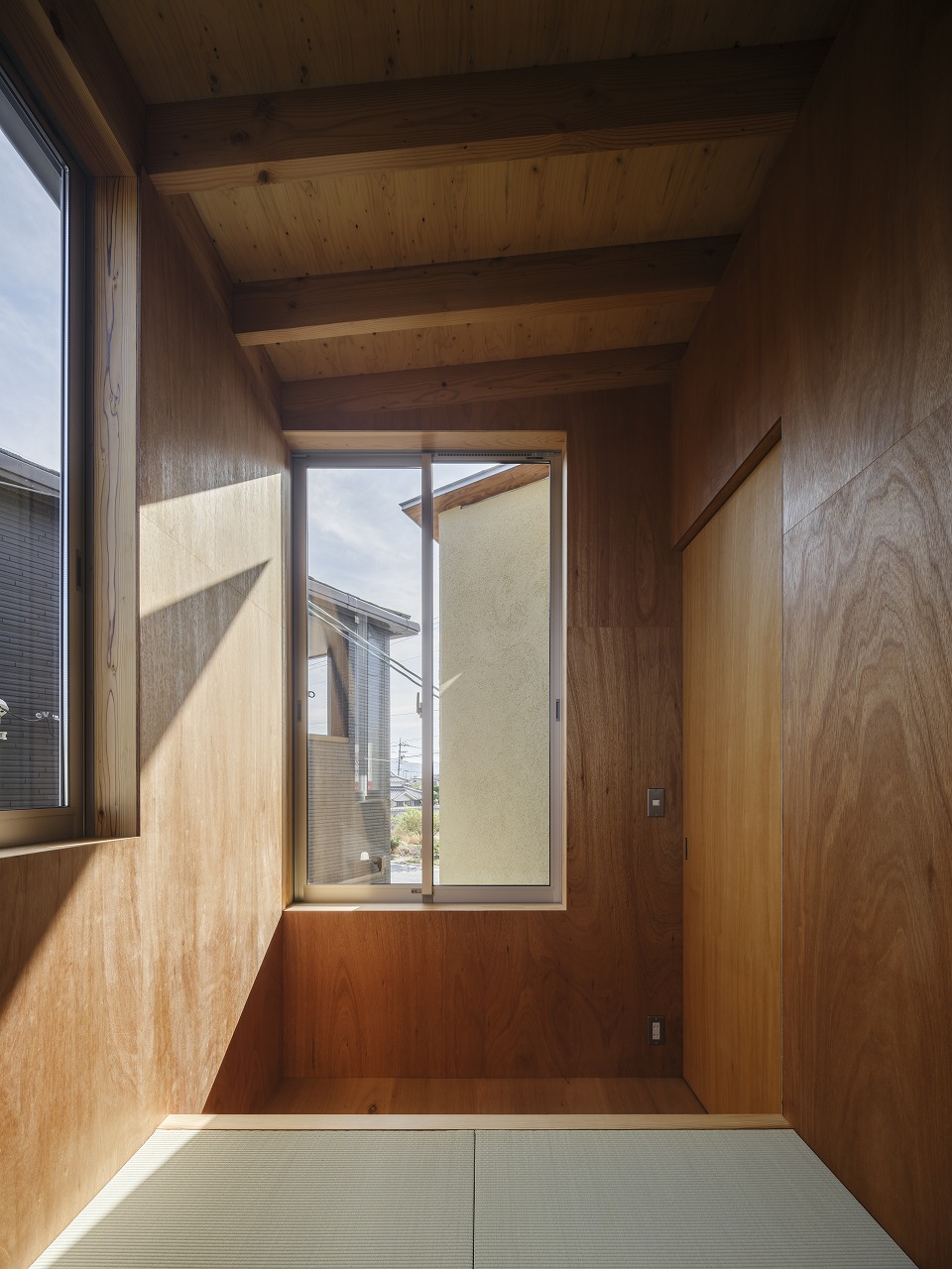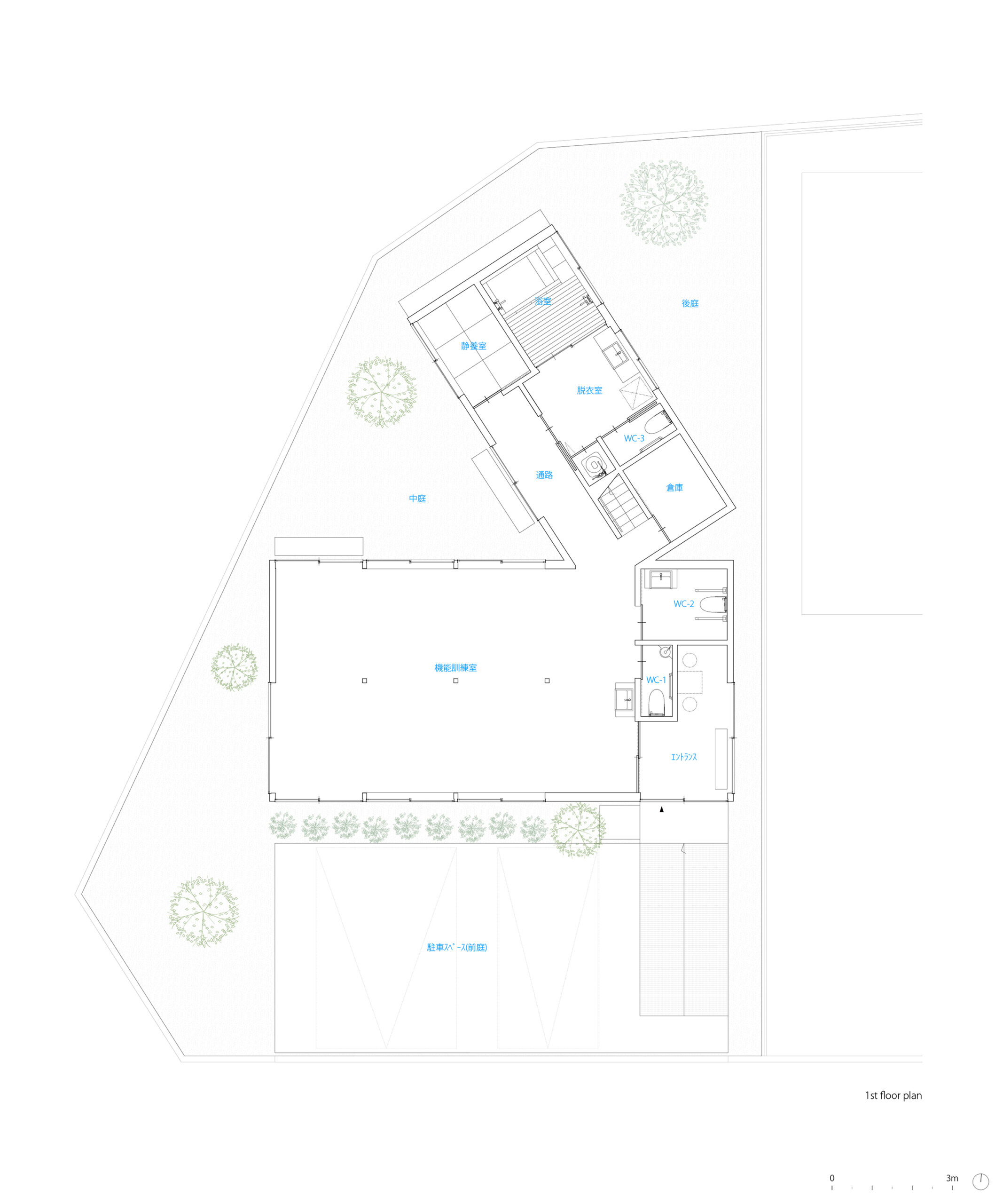 1階、機能訓練室は高さの異なる窓がリズミカルに並ぶ。光や影の表情の移ろいが楽しめるうえ、移動共に外の見え方も変化し、利用者様は心地よい刺激を得られる。床は裸足や靴下で歩き回れるように足触り(踏み心地)や素材感に重きを置いて仕上げ材を選んだ。自宅のように過ごせる