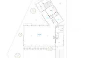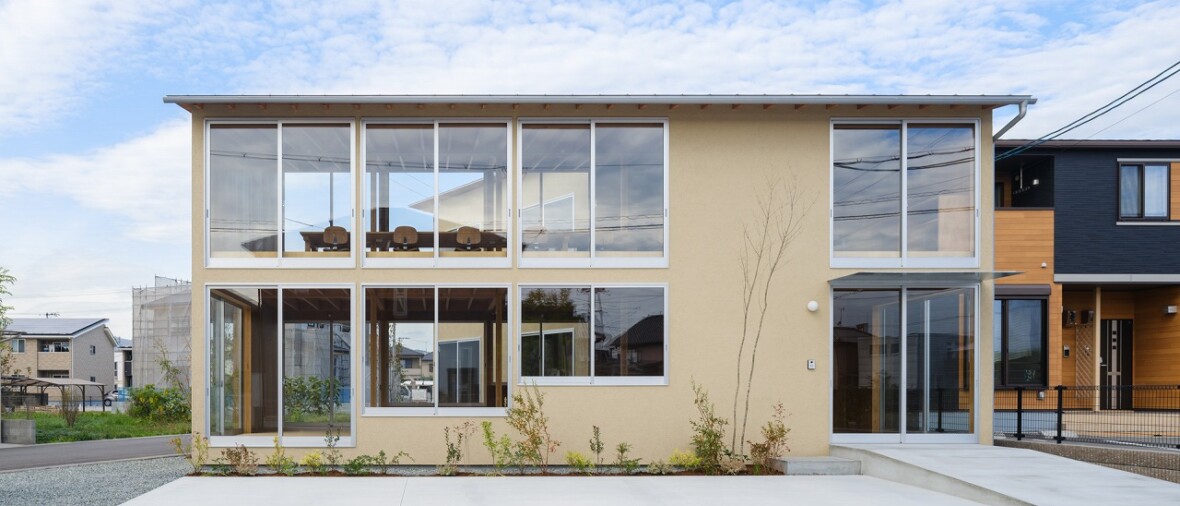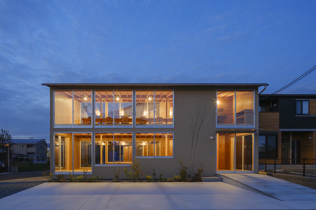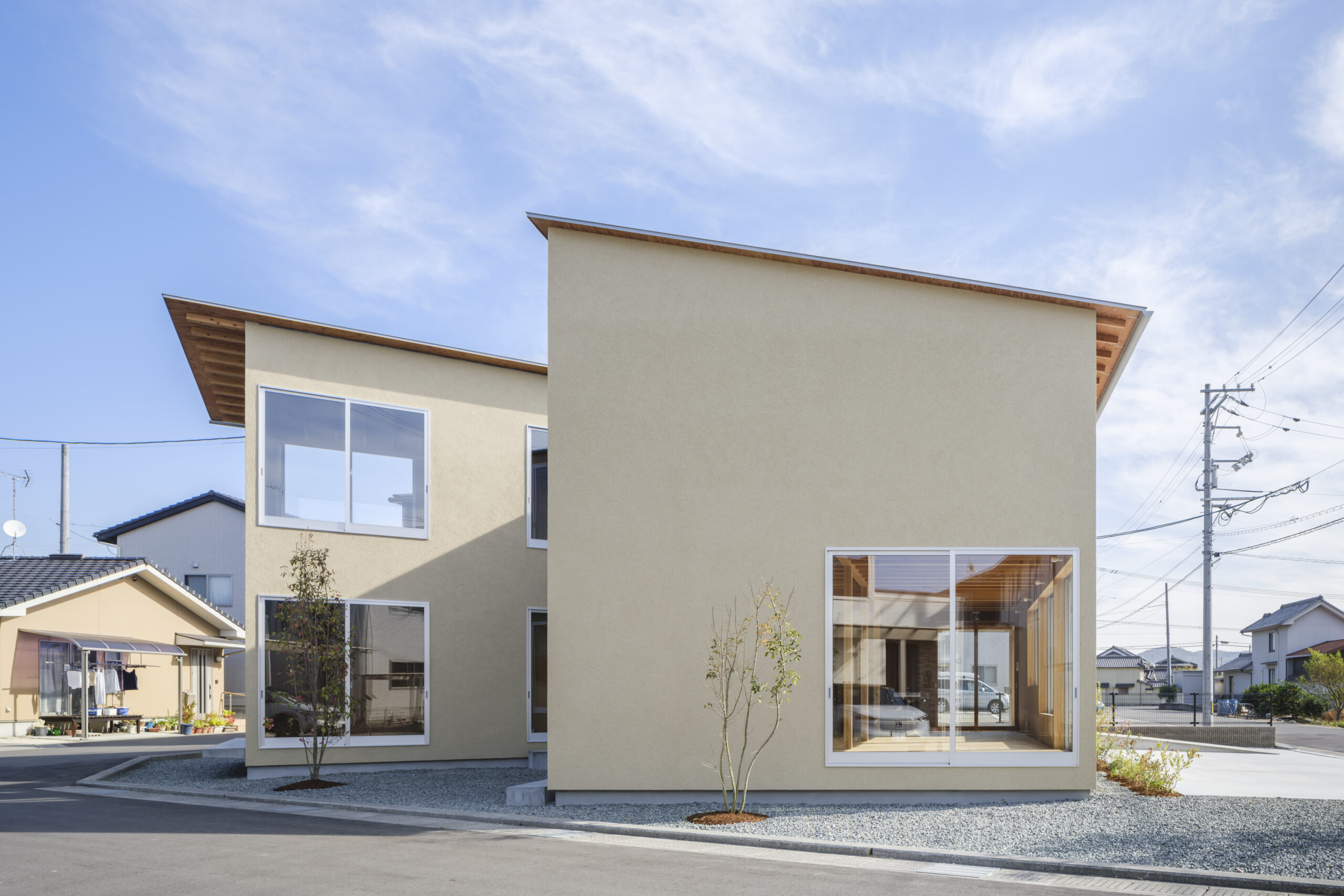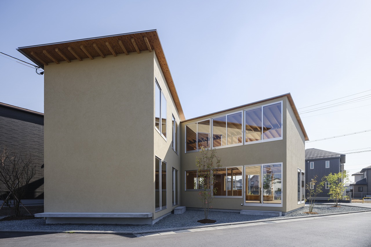 「道上のデイサービス」は敷地の三方を道路に接した角地にある。オーナー様の要望は「この場所に溶け込みつつ、よくある民家を改修したような施設とは異なるオープンな雰囲気の建物にしたい」というもの。建築家の橋本さんは「くの字」の建物を提案し温かみある室内環境と、周辺環境に調和する佇まいを両立させた。