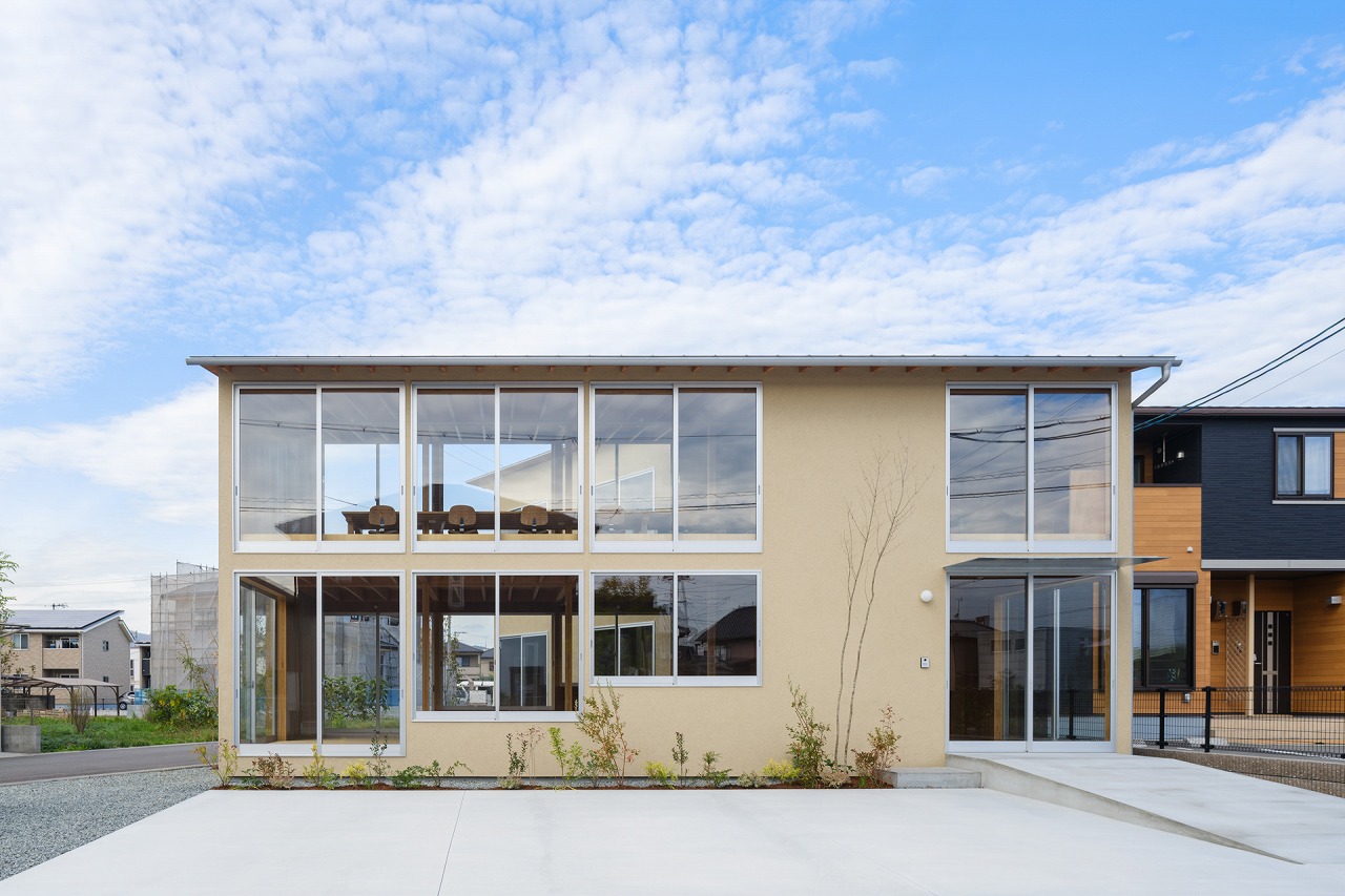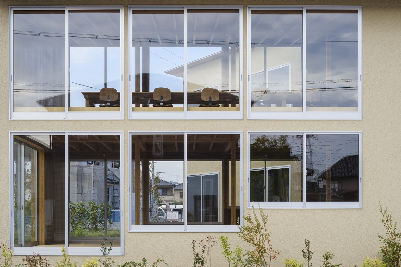 西側から見た外観。全面的に開口した南北だけでなく東西にも開口を設けたおかげで、機能訓練室からは常に外まで視線が伸びる。道行く人も利用者様たちが活動する様子を眺めることができ、安心感を得られる