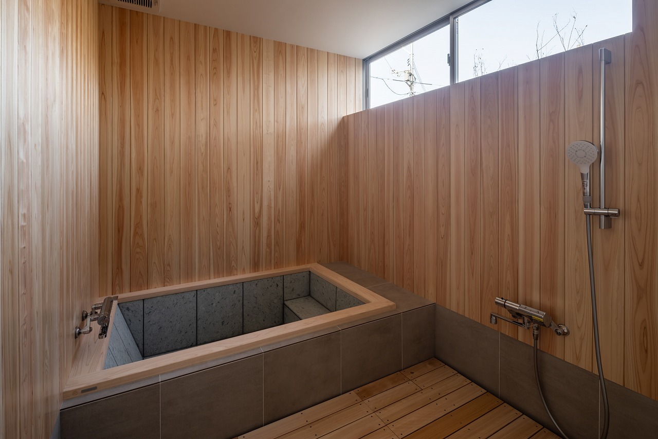 1階、浴室。「日常とは異なる体験をして癒されて帰って欲しい」というオーナー様の要望を実現した檜風呂。昼間に使用するため、ハイサイドライトから日射を取り入れ、より贅沢な時間を過ごしてもらえるよう環境を整えた