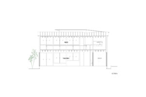 南側から見た外観。右下が入口。1階には機能訓練室を配置し、大きさを変えながら並ぶ連続窓を設けた。2階は事務室。下から延長するような窓を設けることで1階2階がひとつの空間にも見える。中庭側にも同じように窓を計画。視線が反対側へ抜け、オープンな雰囲気が表現されている