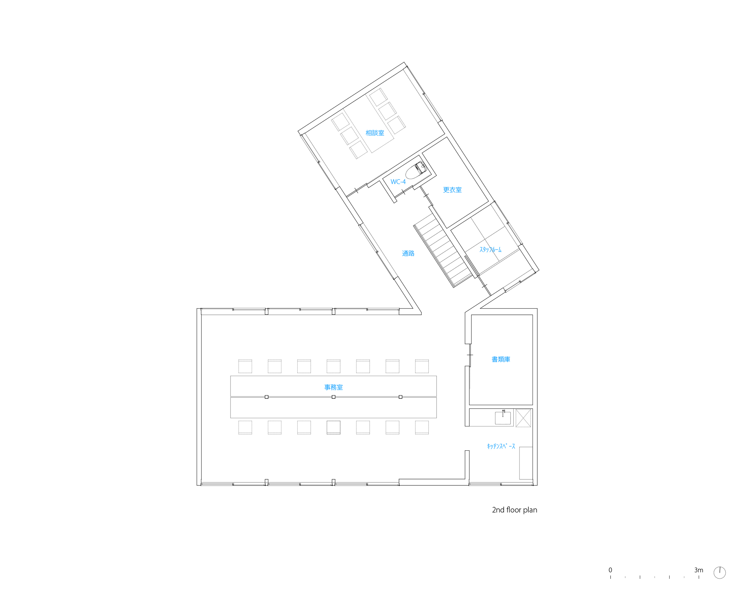 2階、事務室はスタッフ数の変化に対応できるよう大きなテーブルを造作した。南側の窓は掃き出し窓のように計画することで地面が近く感じられ、2階でありながら平屋にいるような気分で過ごせる