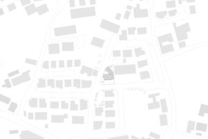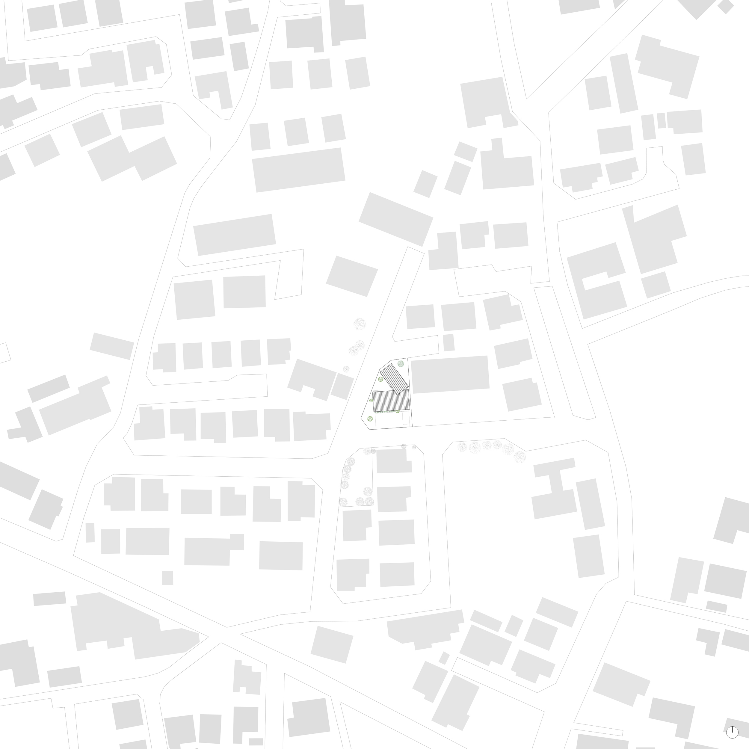 上空から見た建物(右から2番目)。市道に面する南側に駐車場、他にも敷地内に中庭など2つの余白を設け、その余白を躱すように建物を「くの字」に配置した。建物の厚みを薄くし、近隣の家々と同程度の印象を受けるようなボリュームに抑えて地域に調和させた