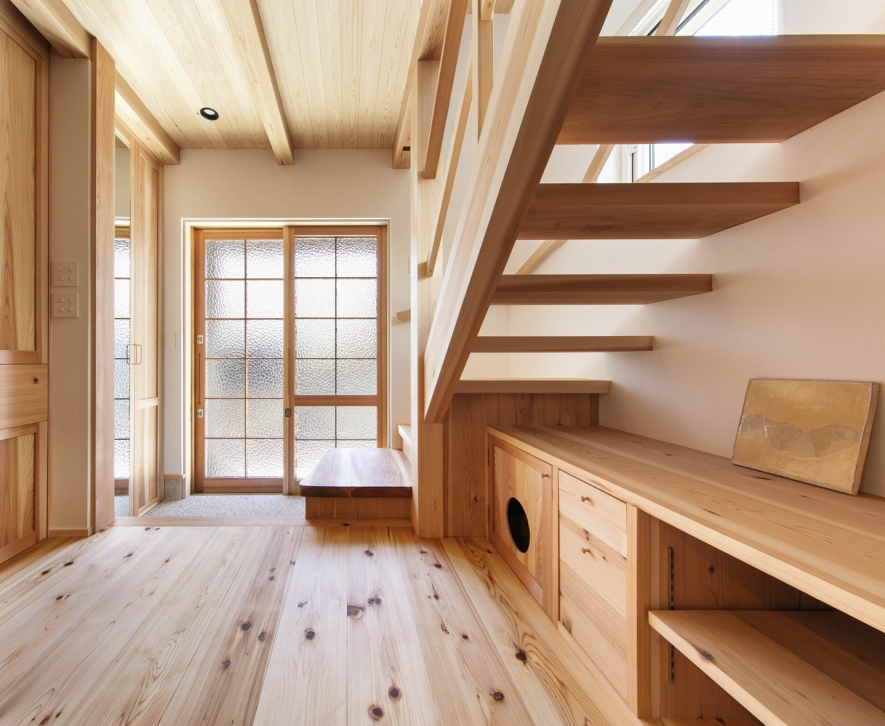 リビングダイニングから玄関を見る。K邸の敷地は3方を隣家に囲まれているが、玄関側は道路に面して最も光を入れやすいため、玄関を型板ガラスのガラス戸にしてたっぷり採光。階段がオープンかつスケルトンなので、階段沿いの窓から入る光や風もリビングダイニングに届く