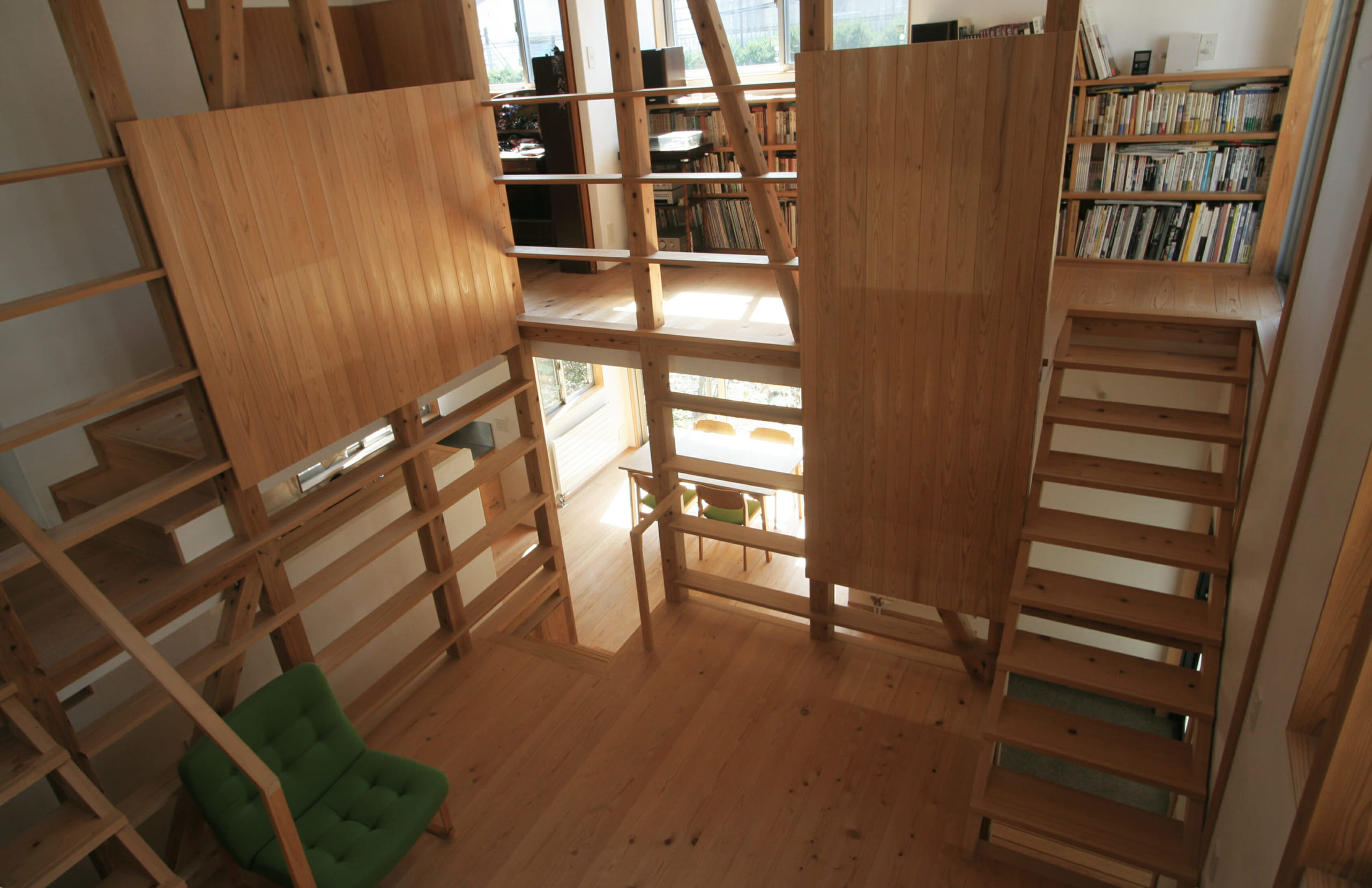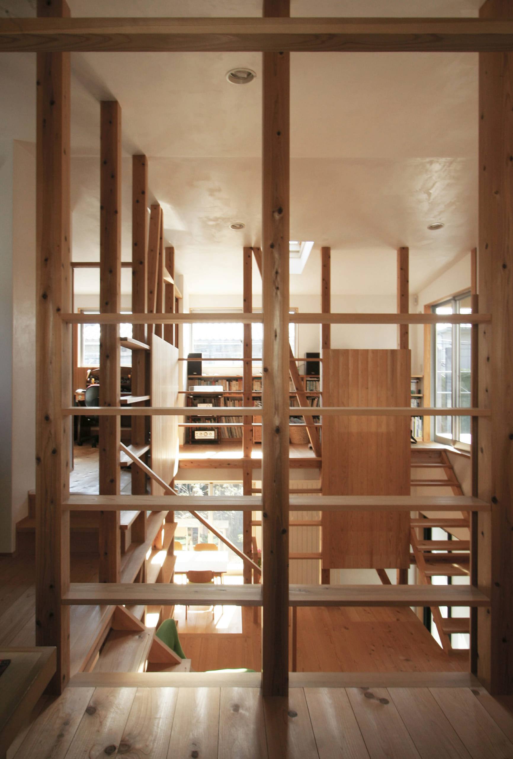 コンヴィヴィウムはラテン語で「共に生きる場所。共に楽しむ場所。」ここは家族皆の居場所になる。コンヴィヴィウムは1階のキッチン・ダイニングと2階の個室の中間のレベルに位置し、上下どこからも視線が通り、風や光も抜け、月の光も落ちる、木に包まれた場所。