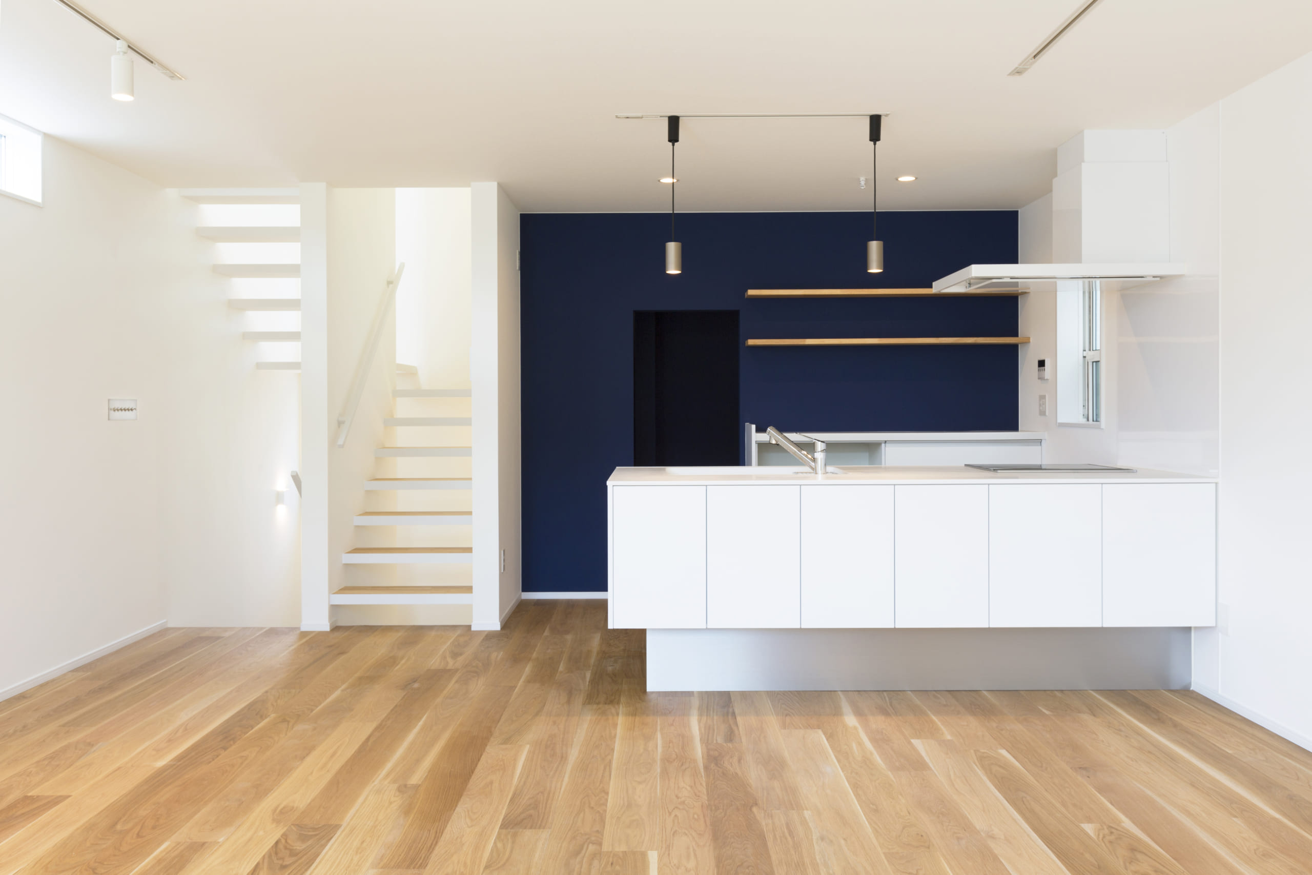 狭い敷地でしたが、2階にリビングを設けることによってオープンキッチンの広々としたLDKを実現しました。