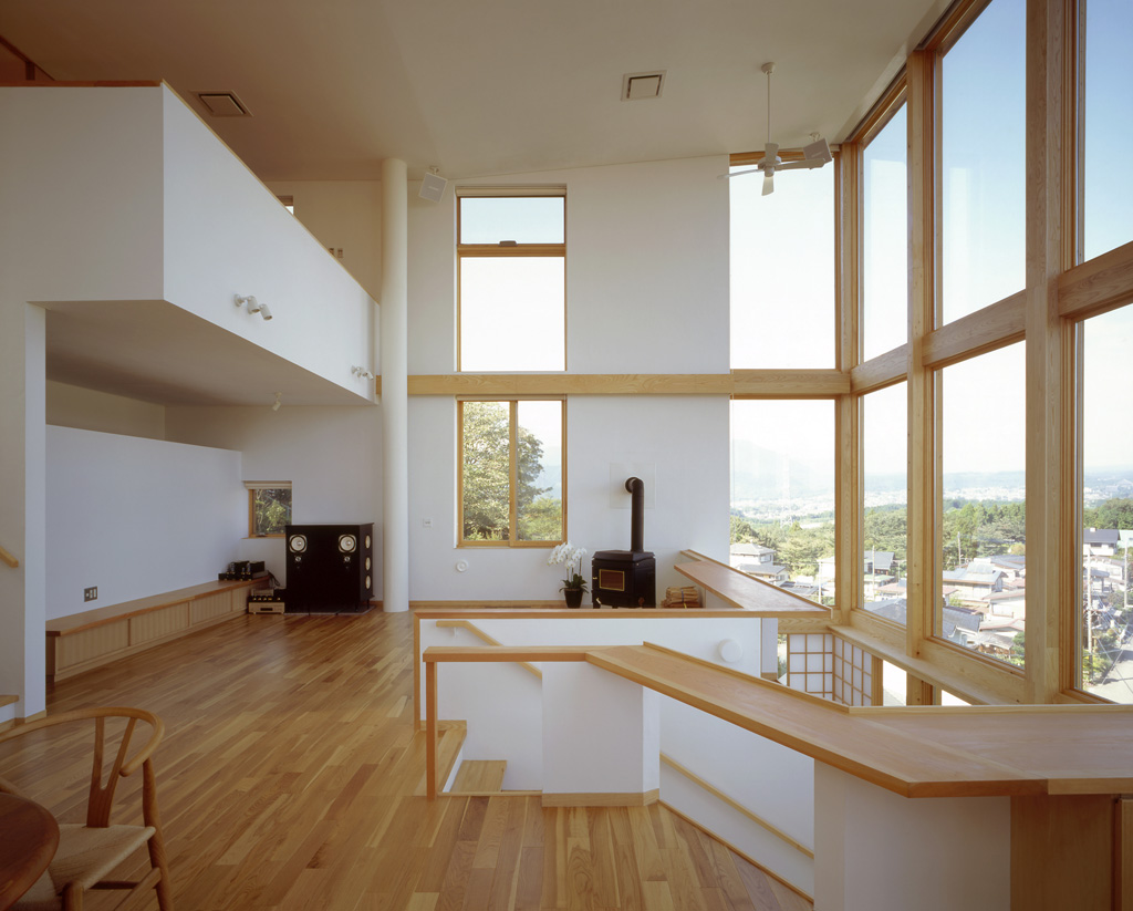 富士宮・青木平は富士山を東に臨む場所である。敷地は28度の東斜面でコナラ・ミズナラ等の雑木林であり、アプローチ道路からは富士山が正面にそびえている。斜面に沿って生活の機能を設定し、全体を一つの空間として覆う事とした。すべての場から異なる角度で富士山を見上げることができる。玄関ホール・居間食堂・寝室・浴室空間が積層する東面は3層吹き抜けのガラス面とし、段差の床全体を鳥かごのような鉄骨で軽やかに覆った。施主様は週末住宅としての利用を考えていたが、ここでの生活を大変気に入られ、こちらに生活の場を移し、用事がある時に東京へ行く生活スタイルに変えられた。